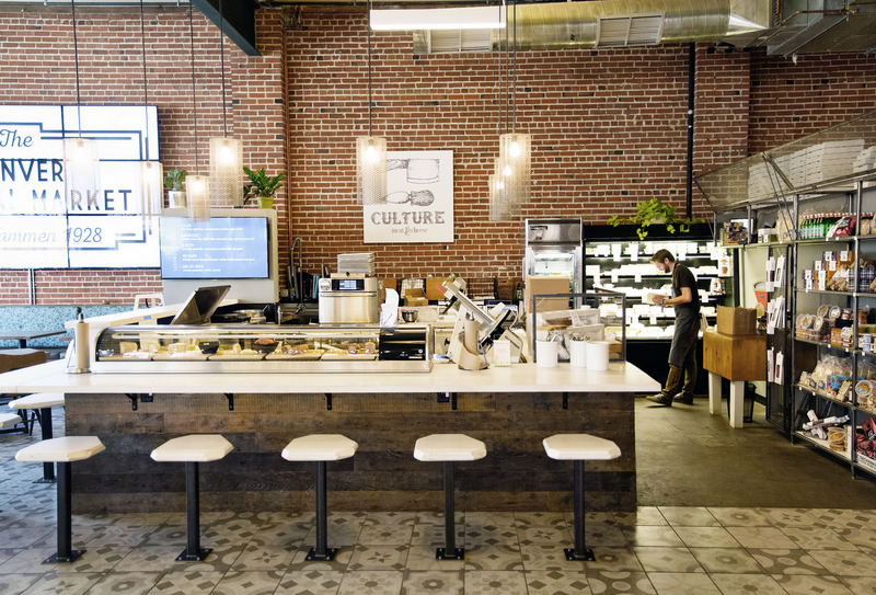 In 1928, retailer H.H. Tammen & Co.’s sprawling new building on Larimer Street housed mementos you might find in a Rocky Mountain gift shop—postcards, souvenir spoons, and quirky little clocks embedded in Colorado gemstones. More recently, the brick-clad space at 2669 Larimer Street was the headquarters of Motorsports Gallery, which sold and repaired classic cars. Walk in today, though, and you’ll find that the four-wheeled tributes to German and Italian engineering have been replaced by the aromas and sounds of 11 purveyors dishing up coffee, chocolate, meat, produce, baked goods, and more. The Denver Central Market, which opened its doors in September, is the kind of place where you might quickly cross a few things off your shopping list or linger over a beer, all while admiring chic, modern design elements thoughtfully arranged on an industrial stage.