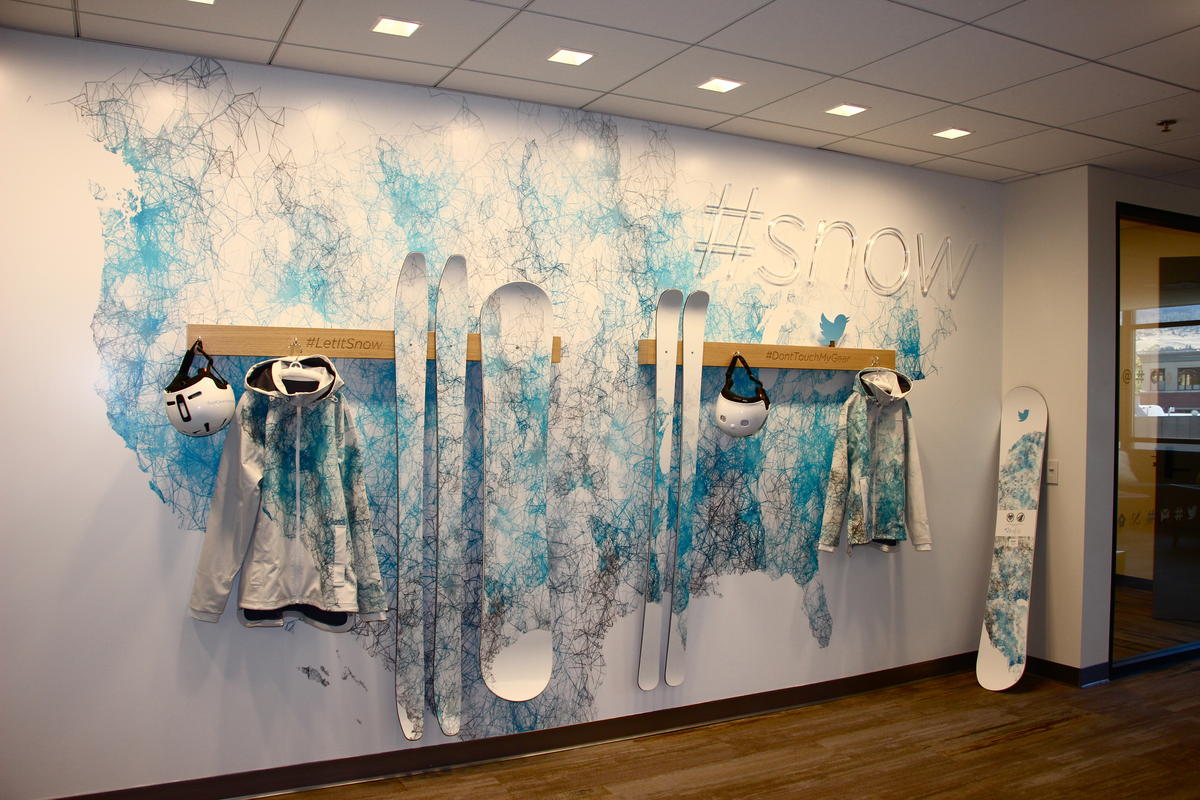 As for the Boulder office, it’s exactly what you’d expect. There’s not a single cubicle in sight. Instead, employees share community tables in large rooms awash in natural light. They can choose from a traditional seat or standing desks, migrate to private or semi-private nooks throughout the office, or reserve sound-proof (but see-through) glass stalls. Murals espousing the company’s vision adorn the walls, including one that depicts cross-country Twitter conversations about #snow that stretches over a Never Summer gear installation. Exposed networking wire runs overhead, calling to mind how, exactly, the magic happens.