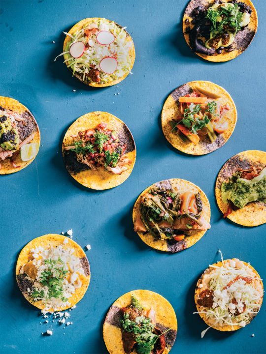 Ahead of the party, a skin-on pork leg slow-roasts in an aromatic rub for Yucatecan cochinita pibil; the feet pickle in tangy brine before being slivered onto crispy tostadas. The ribs, tail, and belly become carnitas after several hours of bubbling away in manteca madre (seasoned rendered lard) in a cauldron-size cazo, the traditional pot used in Jalisco to coax out the most intense flavors. The collar goes into inky frijoles negros con puerco seasoned with chiles, cumin, and avocado leaves. Bright salsas; creamy rajas (strips of poblano chiles cooked in a rich sauce with mushrooms, onions, and roasted corn); curtido (a Yucatecan slaw vibrant with habaneros); and ensalada de nopales (prickly pear cactus) round out a feast bursting with freshness and spice.