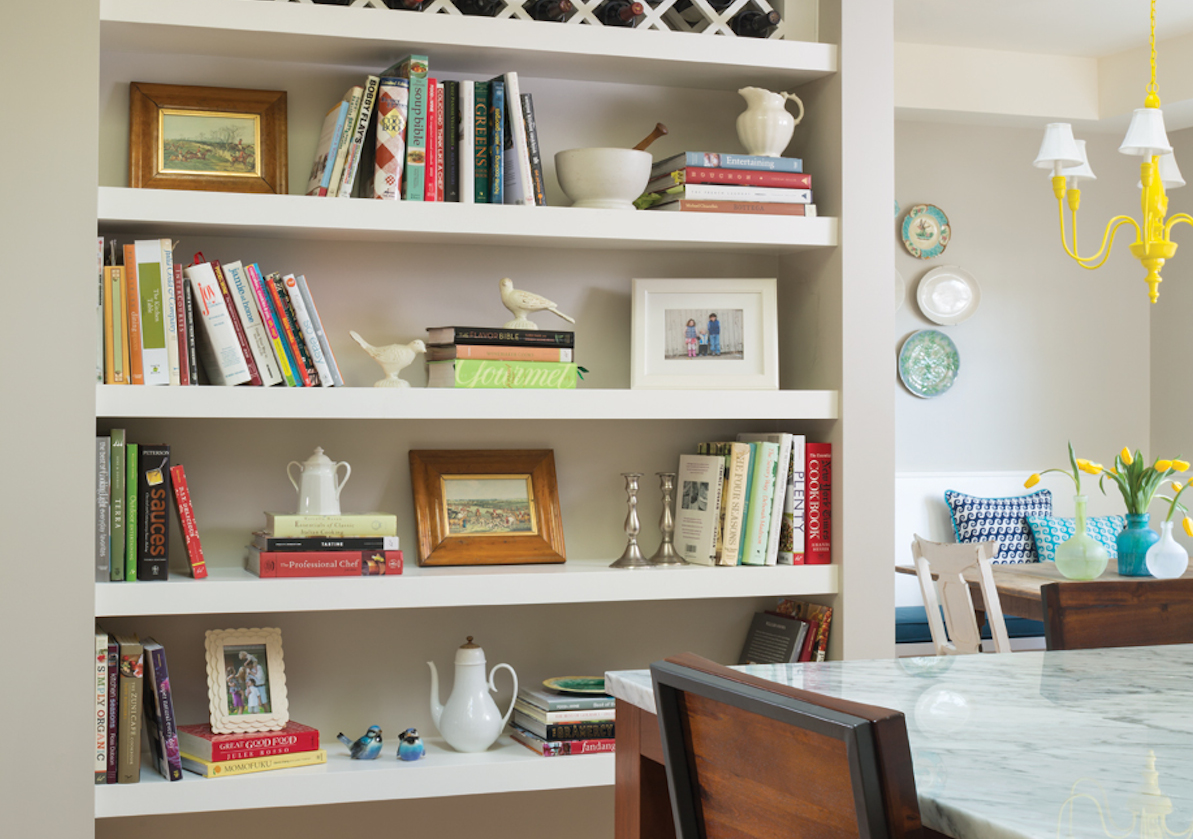 Custom Shelves: Opt for fixed shelves rather than adjustable. “Most people never adjust their shelves, anyway,” says Armijo. “A fixed unit—without peg holes—makes for a more finished look.” Just be sure to measure your cookbooks first.
