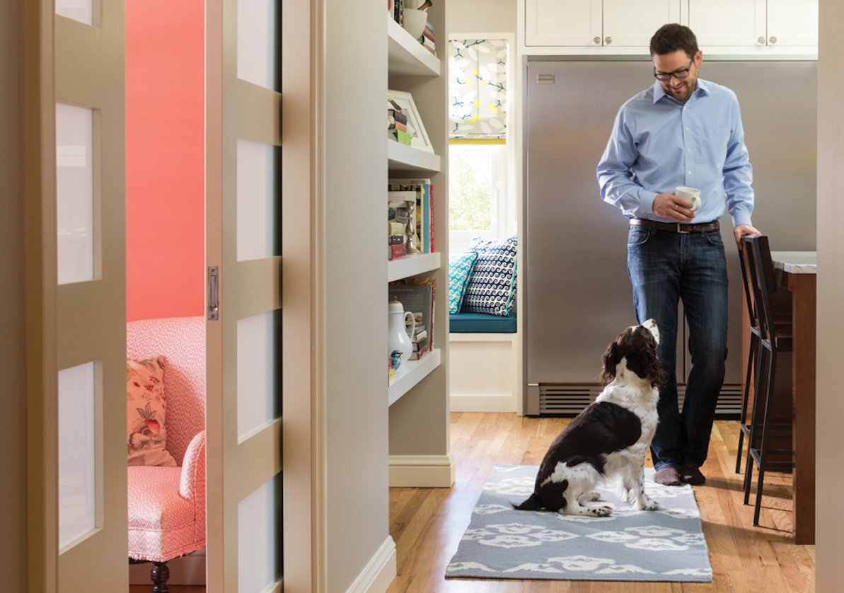 Dramatic Openings: “Doors are a fun way to change texture and add architectural interest,” Armijo says. The frosted glass on the study doors brings natural light into the hallway—and the transitional moldings add an unexpected modern accent.