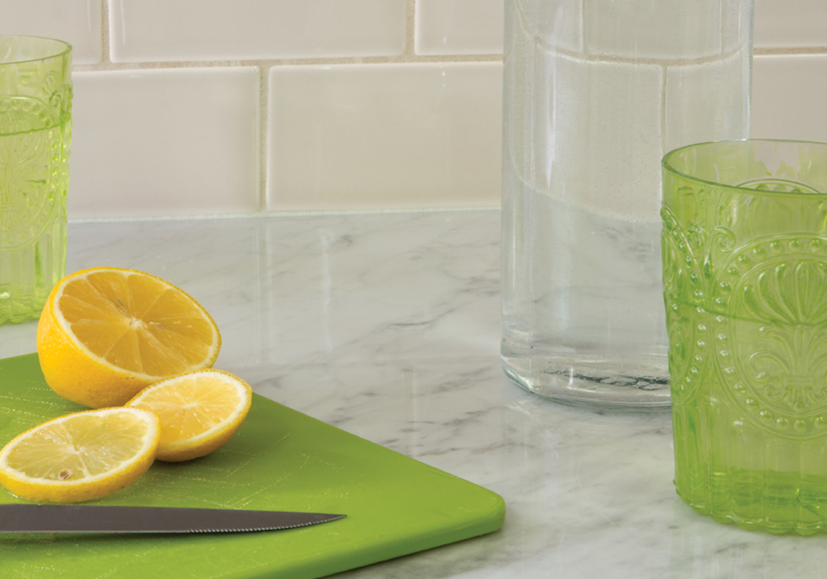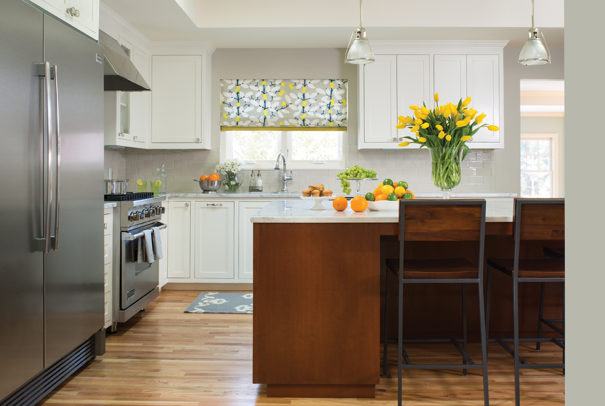 Hints of Color: “Classic white kitchens can get boring without some color and textural variations,” says Armijo. Here, gray subway tile on the backsplash and white marble with veining for the countertops are anything but dull.