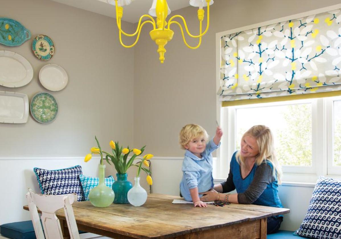 Lights: “Find ways to give older items new life,” says Armijo. The whimsical yellow light fixture over the banquette is actually an old light with a fresh coat of paint.