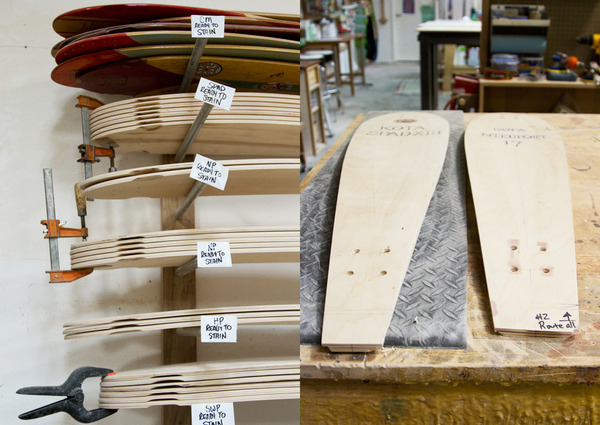 (Pictured, left) Hand-cut boards are bundled and pressed to await wood staining. (Pictured, right) Maloney put his engineering degree to good use while determining the basic designs for KOTA boards. To provide riders a “land surfing” experience, Maloney focuses on camber (arch from tip to tail). The arch in a KOTA board allows for agressive carving and better speed control
