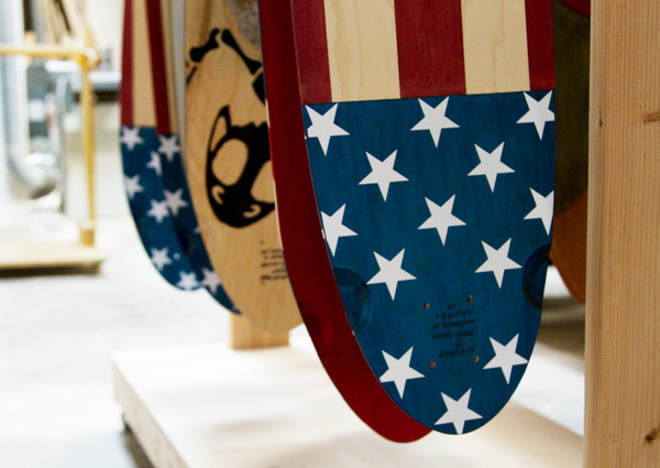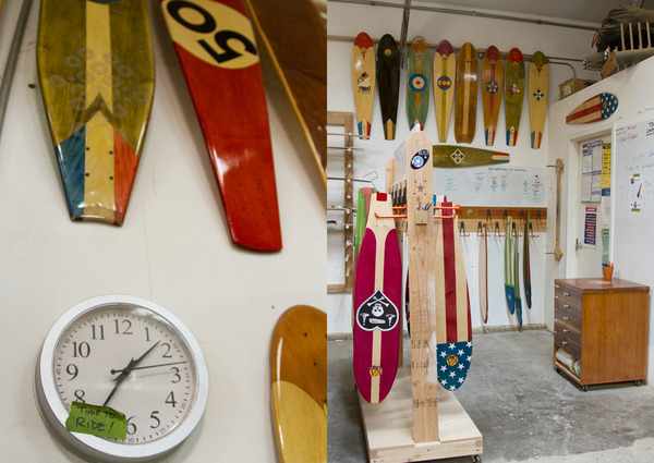 (Pictured, left) Finished boards, made of hard rock maple from Wisconsin, hang on the wall in the Denver shop. Maloney says he often lets the natural grains of the wood determine which design will be stained onto it. (Pictured, right) At the end of the production line, boards await wheels. KOTA sources an exclusive line from Seismic Skate Systems in Boulder