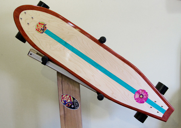 That seems to be a consistent trend for all the company’s products. Maloney says KOTA has seen 300 percent growth, quarter over quarter, compared to last year. The company produces various sizes and designs for riders of all ages, with a specific focus on bringing more 30- to 50-year-olds into the longboarding community. The vinyl designs all spring from Maloney’s mind, from subtle touches of color to a full-blown Colorado flag. Maloney’s military background (he flew F-14s in the Navy) also has a strong presence. (KOTA stands for Knights Of The Air, a moniker for WWI Air Force pilots.) Each longboard style is named after an airplane, KOTA has a full Military Series of designs, and Maloney offers 10 percent off to military members and allows them to custom design boards with their unit insignia.
