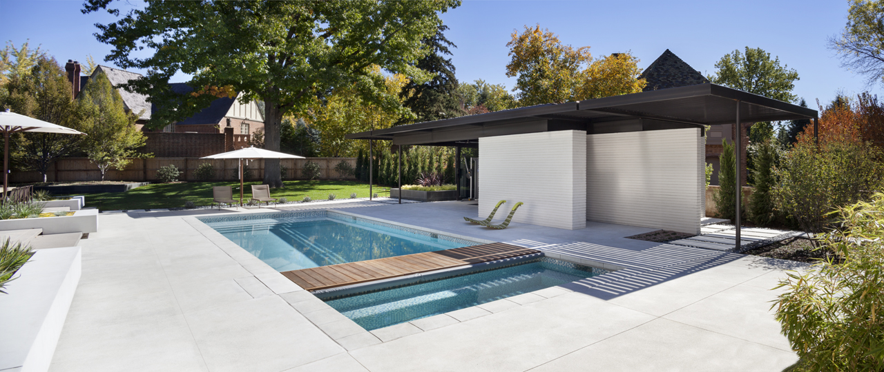 Pool Area: MU Collection lounge furniture and Fedro Floor Rocker in Quetzal, both Dedon, dedon.de; Tucci umbrella, Charles Eisen & Associates, Denver Design District, 595 S. Broadway, 303-744-3200, eisenassociates.com.