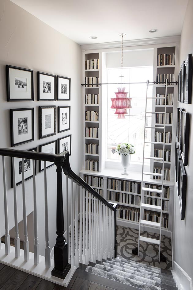 A custom bookcase and vivid light fixture make this landing turned library a stairwell showstopper.