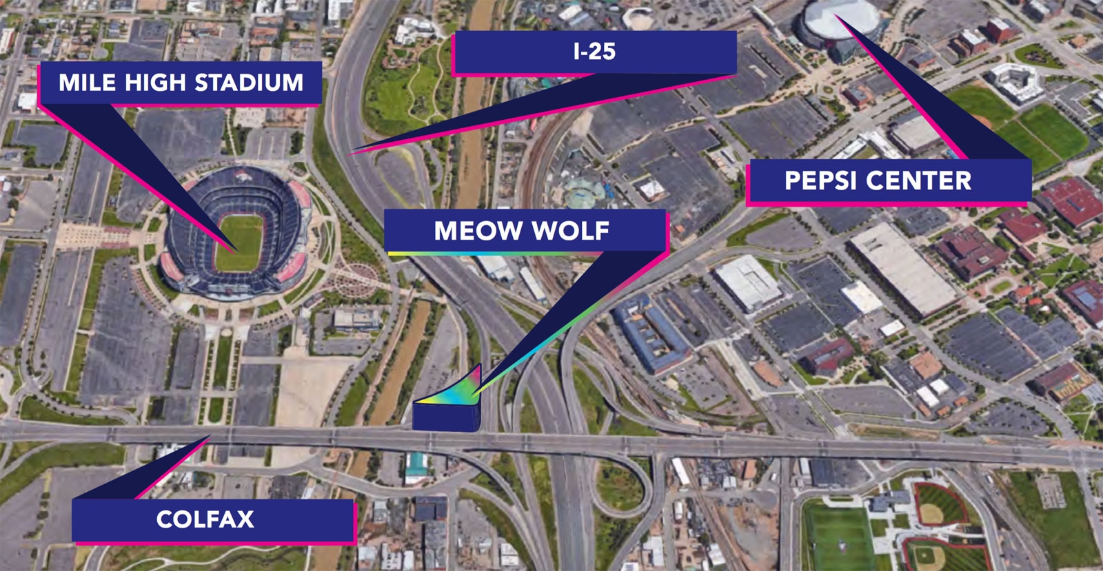 - Meow Wolf Denver will be located on Colfax Street right next to I-25 and will be surrounded by viaducts on three sides.