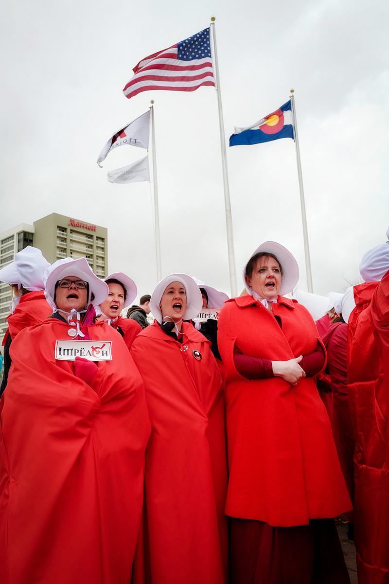 Many women fear that Atwood’s warning tale is merging with reality under the administration of Donald Trump and Mike Pence. “I don’t think the future that the novel was positing is so off-base from where this current president would like us to be,” says Jessica Zender, who leads the Steering Committee for Indivisible Denver, a progressive grassroots organization.