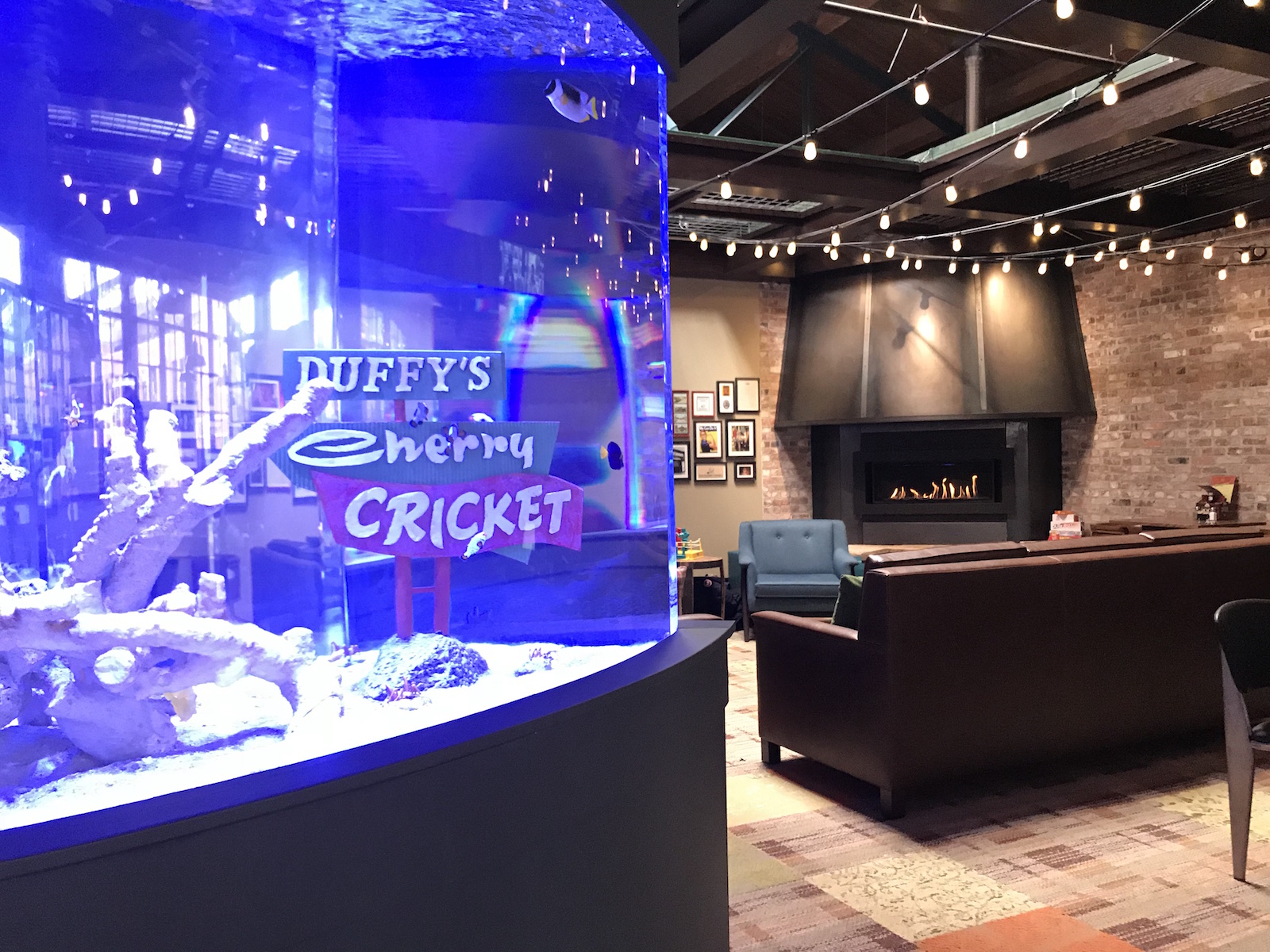 Further back, alongside the blue-lit saltwater aquarium that anchors the space, is a comfortable lounge area replete with overhead string lights, a fireplace, soft seating, and board games; a community table dining area near the kitchen; an arcade with eight pour-it-yourself beer taps and everything from four-person Pac Man to Guitar Hero to Skee-Ball; and a carpeted dining area with televisions and a ceiling installation of reclaimed wooden crates.