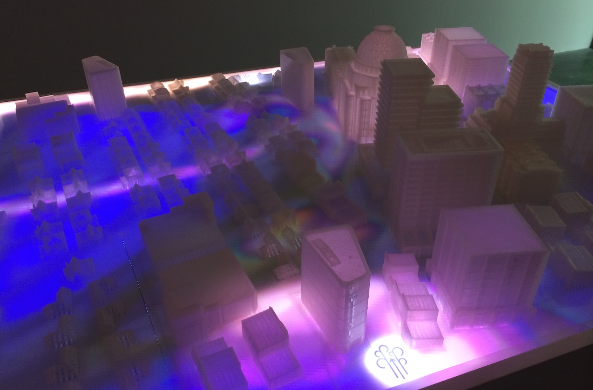 Denver-based artists Chris Coleman and Laleh Mehran tackle one of their most ambitious projects yet (which is saying something, trust us) with “Unclaimed.” The interactive piece invites visitors to blow air along the 3D-printed cityscape and then see the impact firsthand through the change in color on the 34,000-bulb LED grid below, on two video screens at either end, and through the reaction of fans above. “We’re exploring the unclaimed chunk of air above buildings but below FAA controls,” Mehran says. (Read more about Mehran in “Outside The Lines.”)