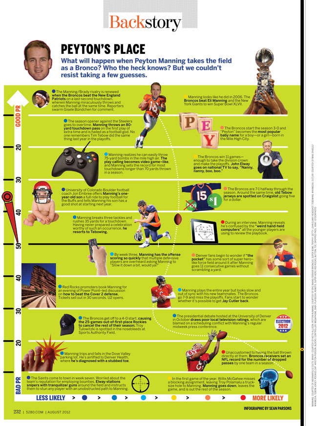 What will happen when Peyton Manning takes the field as a Bronco? Who the heck knows? But we couldn’t resist taking a few guesses.