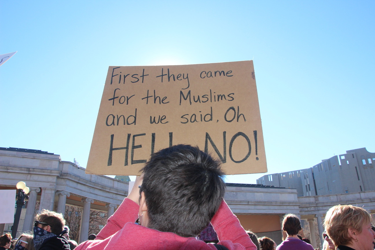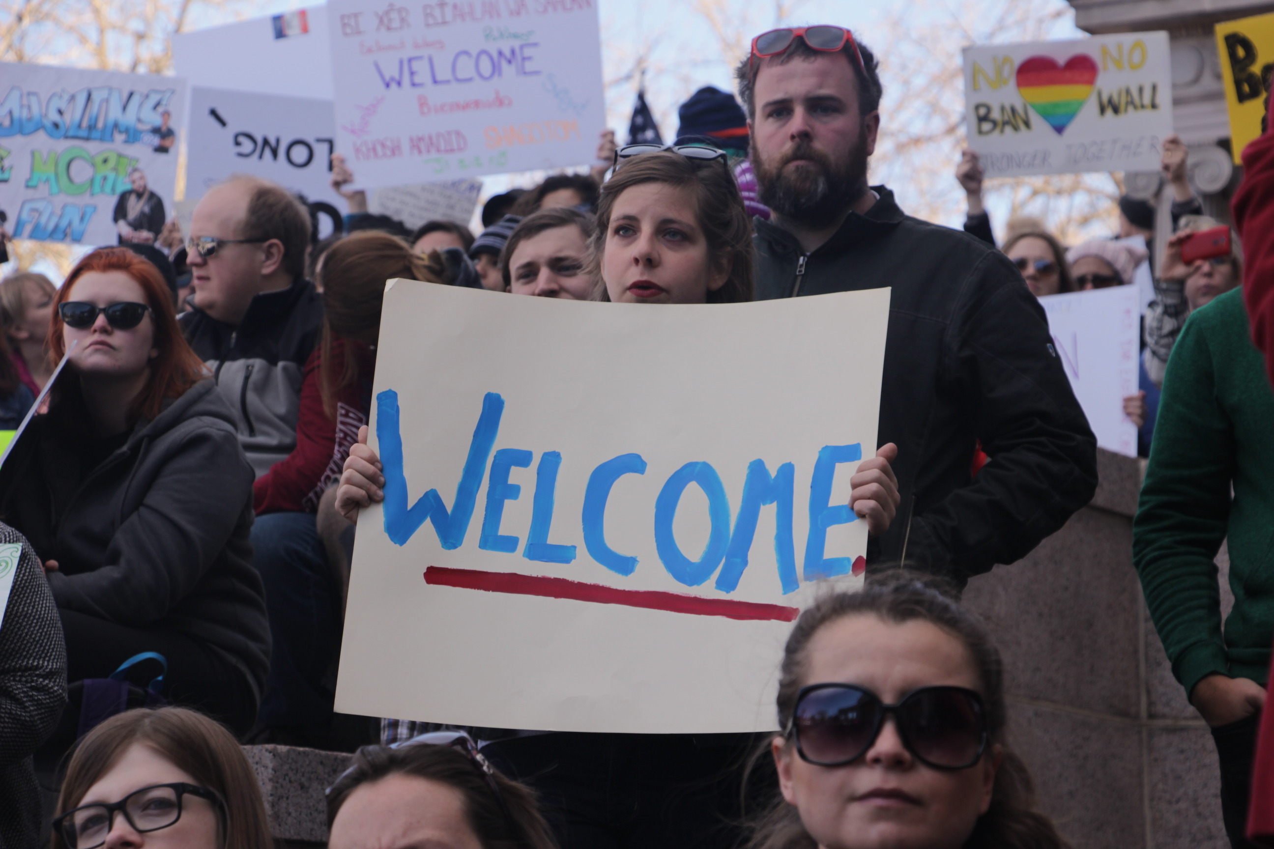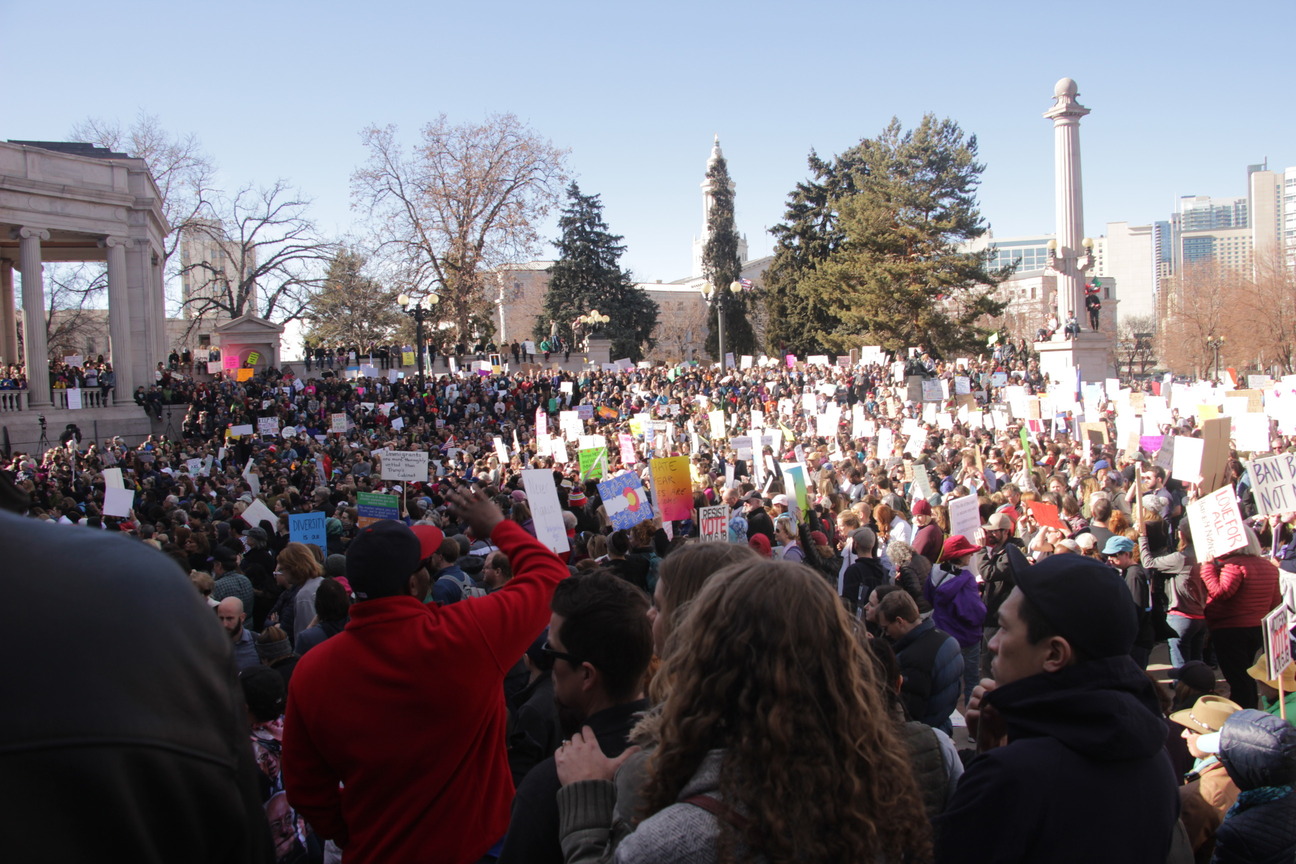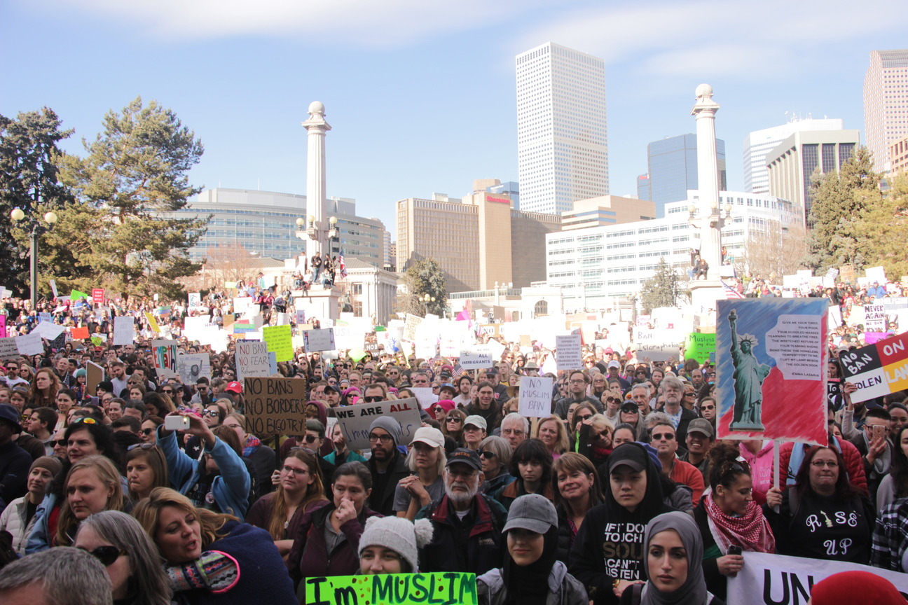 Despite the cold, masses huddled in the shade of the Greek Amphitheater of Denver’s Civic Center Park Saturday afternoon, spilling into the sunny lawn beyond its courtyard and collecting in the grassy space facing the Denver Art Museum. Members of the crowd held signs with slogans like “No Ban No Wall,” “We Are All Muslim,” or pictures of the Statue of Liberty with the words “Did I Stutter?” scrawled beneath it.