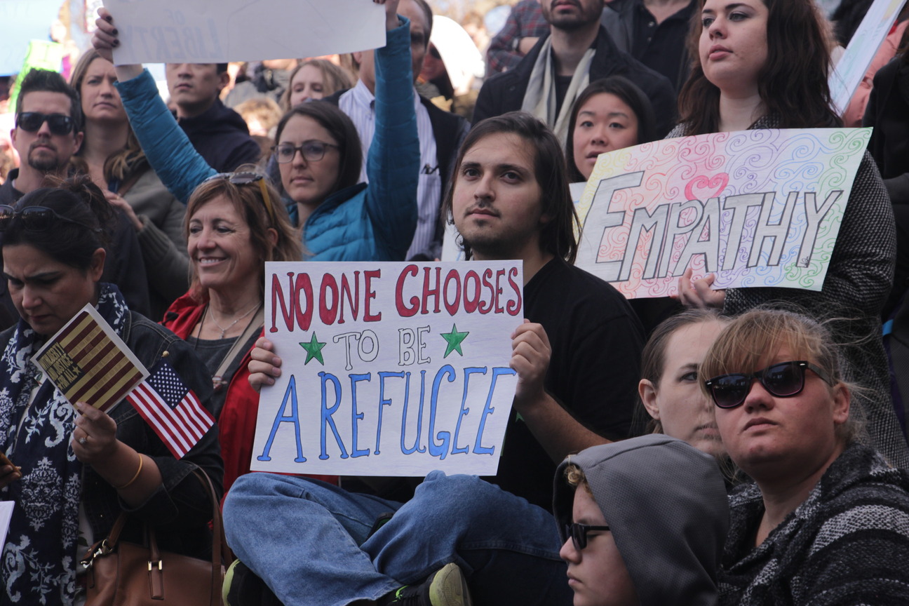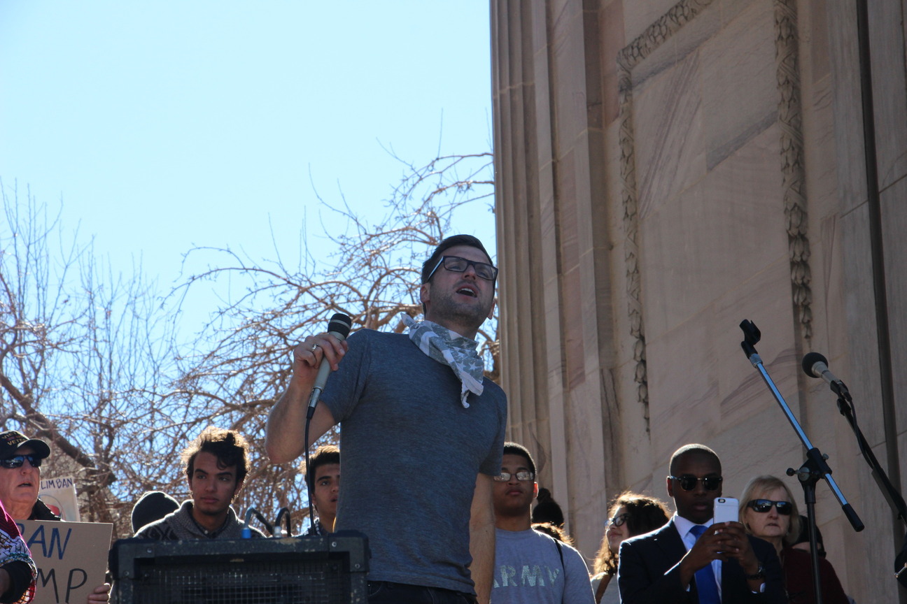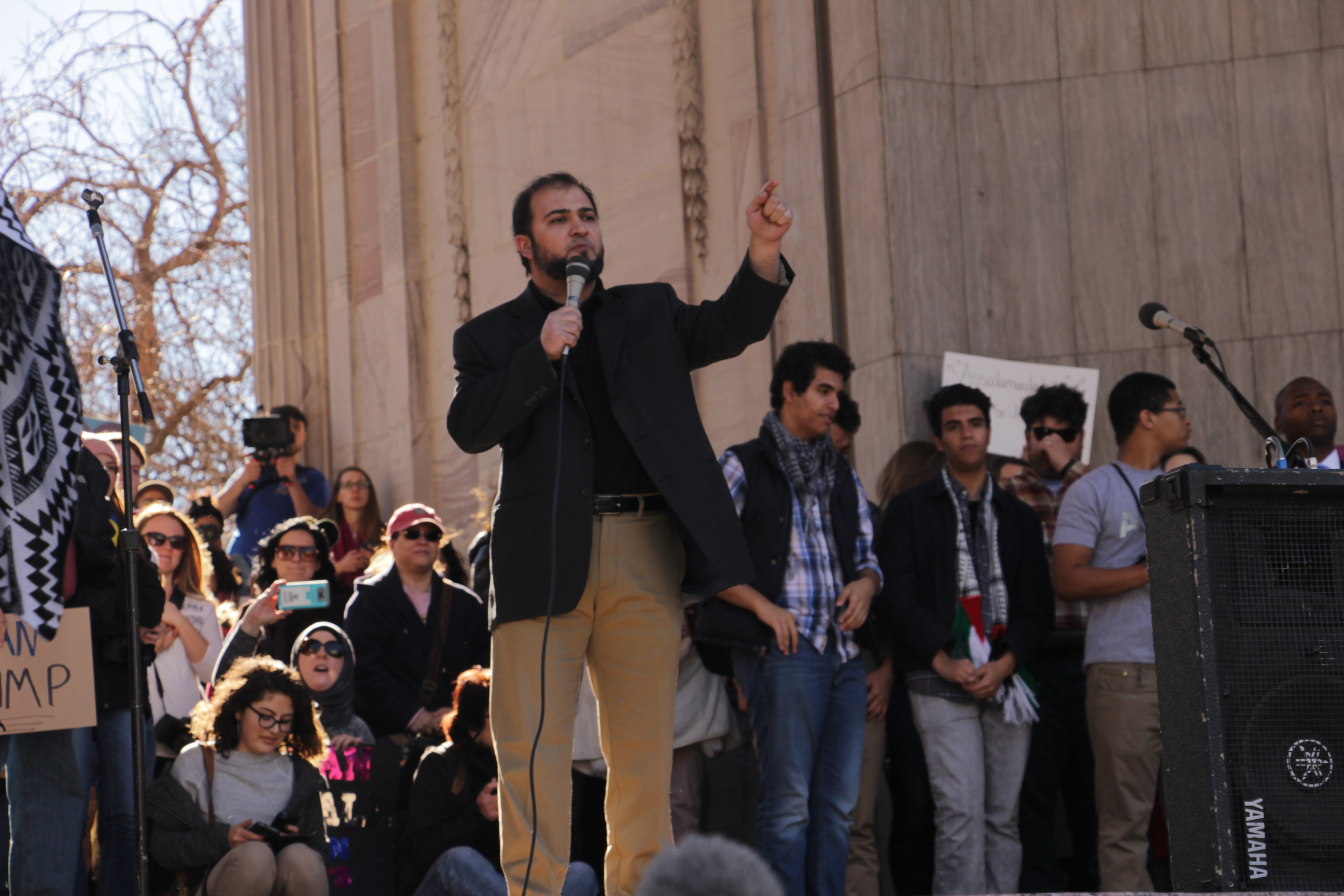 Despite the cold, masses huddled in the shade of the Greek Amphitheater of Denver’s Civic Center Park Saturday afternoon, spilling into the sunny lawn beyond its courtyard and collecting in the grassy space facing the Denver Art Museum. Members of the crowd held signs with slogans like “No Ban No Wall,” “We Are All Muslim,” or pictures of the Statue of Liberty with the words “Did I Stutter?” scrawled beneath it.