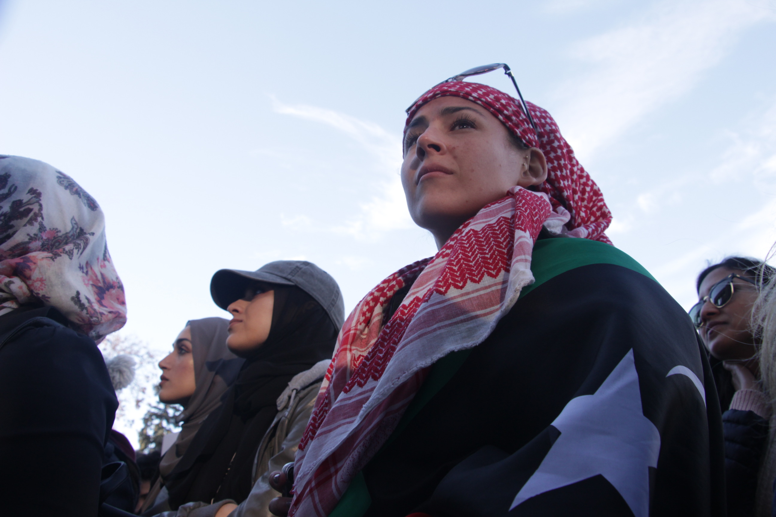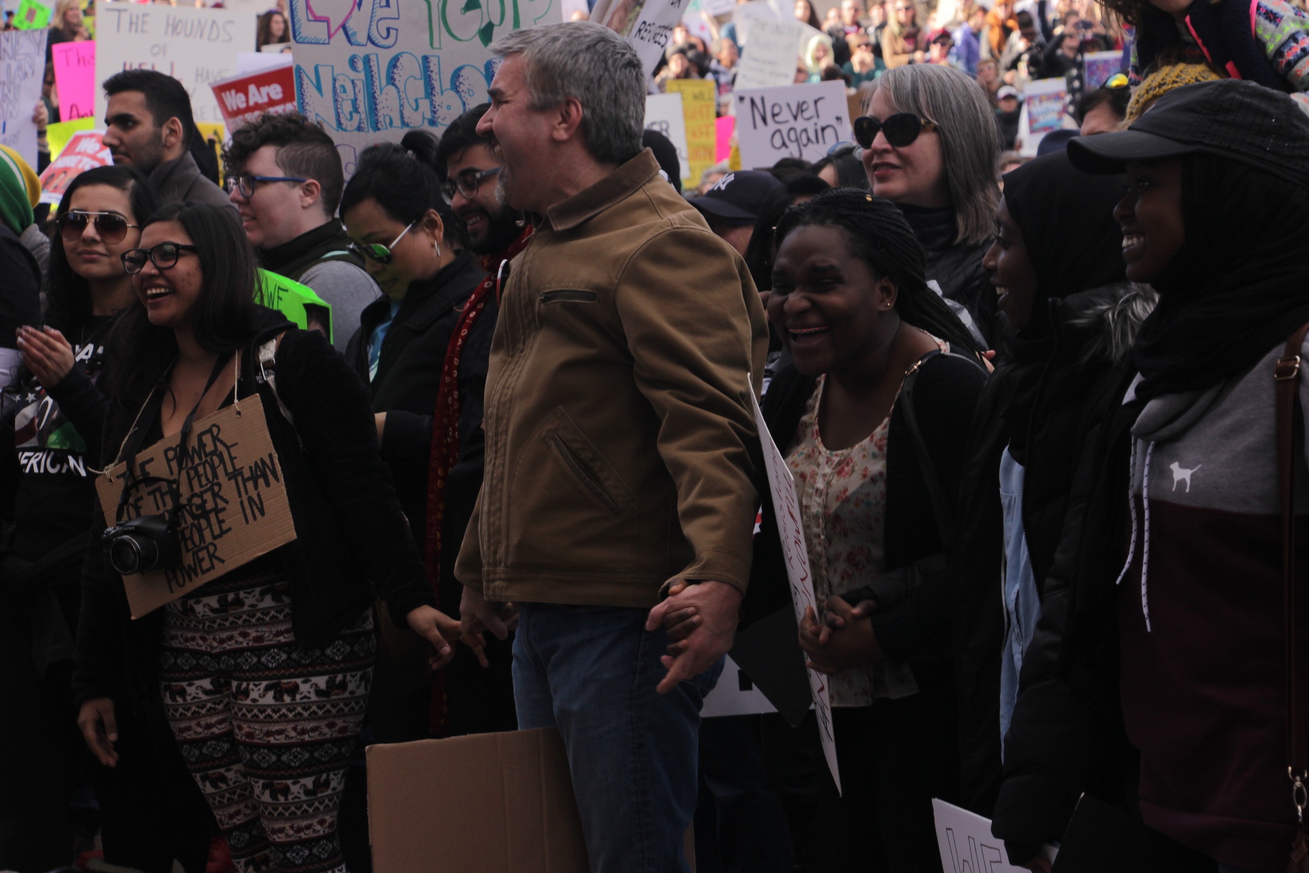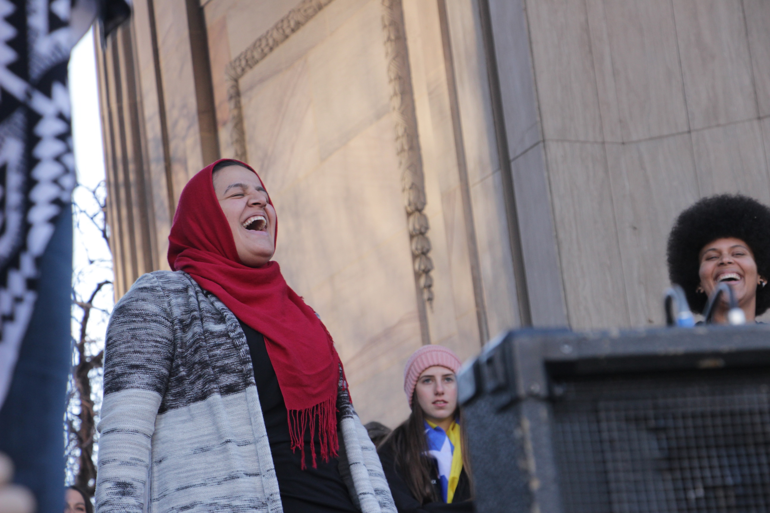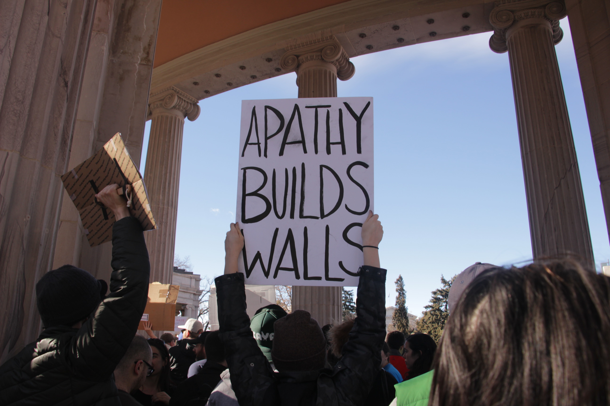 Despite the cold, masses huddled in the shade of the Greek Amphitheater of Denver’s Civic Center Park Saturday afternoon, spilling into the sunny lawn beyond its courtyard and collecting in the grassy space facing the Denver Art Museum. Members of the crowd held signs with slogans like “No Ban No Wall,” “We Are All Muslim,” or pictures of the Statue of Liberty with the words “Did I Stutter?” scrawled beneath it.