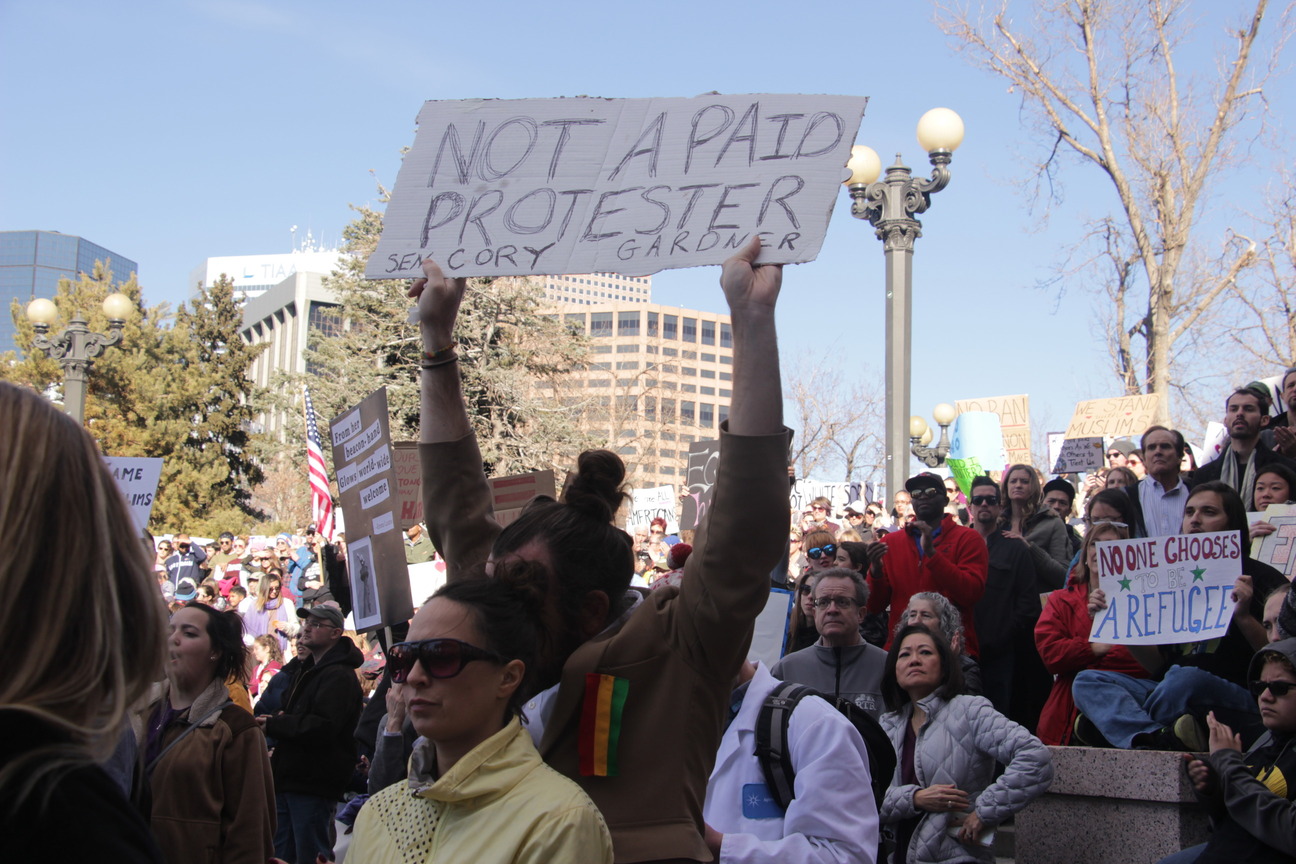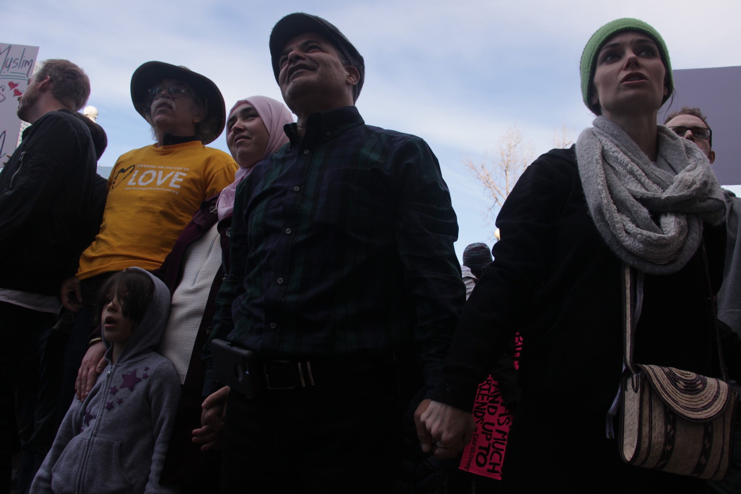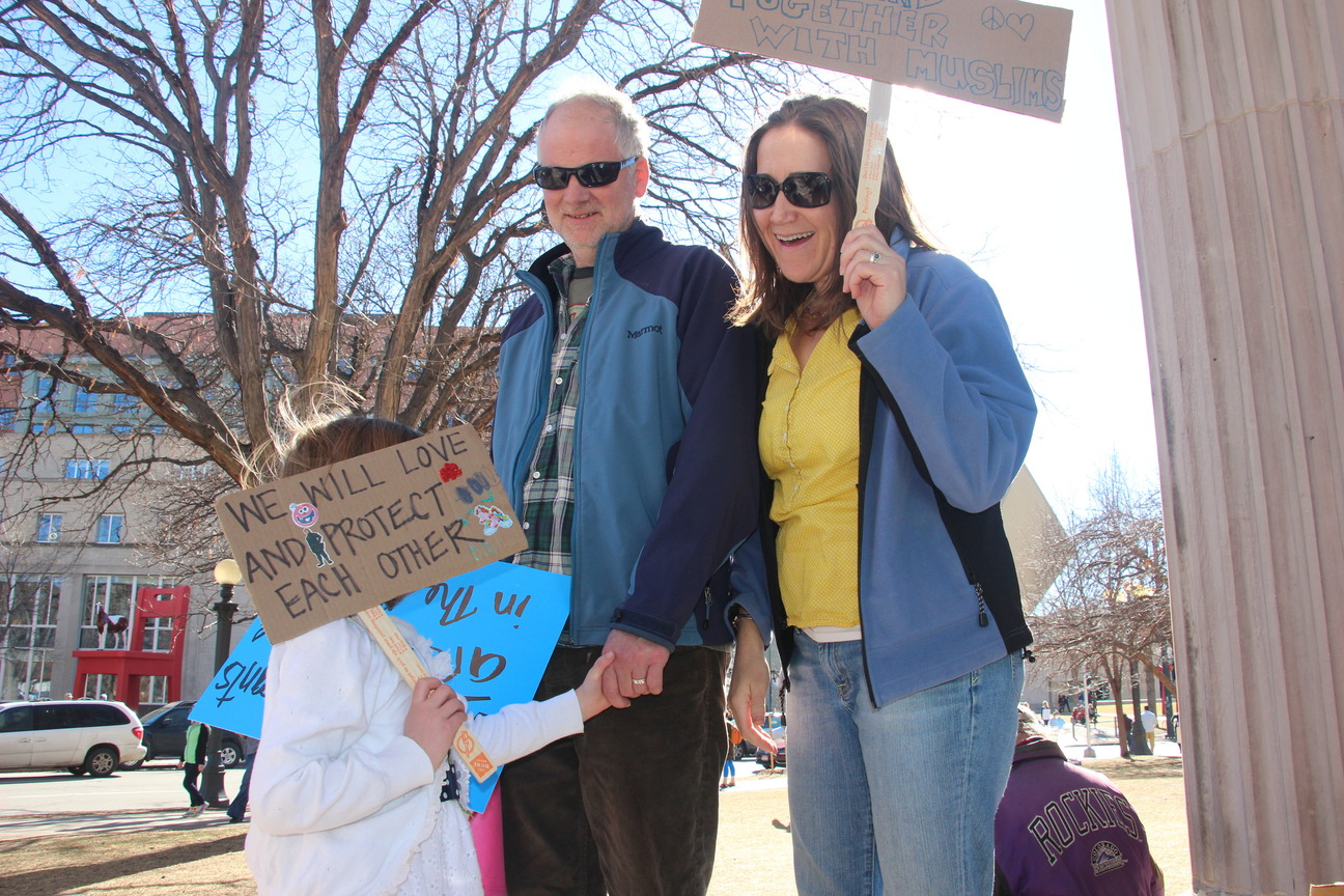 An estimated several thousand people gathered Saturday afternoon to participate in the Protect Our Muslim Neighbors Rally, organized by Queen Phoenix, a leader of the advocacy group Community for Unity, and other local activists, to show support for Colorado’s Muslim population. The demonstration took place one week after President Donald Trump signed an executive order that halts the entry of nationals from seven Muslim-majority countries for 90 days, and prohibits refugees from entering the United States for 120 days. That ban was recently lifted, at least temporarily, by a federal judge. Trump had campaigned on the unsubstantiated claim that Syrian refugees pose a threat to U.S. security. (Read about his likening of Syrian refugees to snakes at a Denver rally last summer).