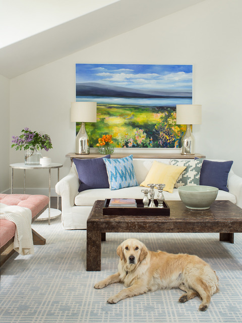 That was our intent. In the living room, for example, the large landscape painting dictated the color palette. We commissioned local artist Alice Messinger, who worked with us to incorporate the colors we wanted, including that little hint of coral pink that we repeated on the upholstered bench.