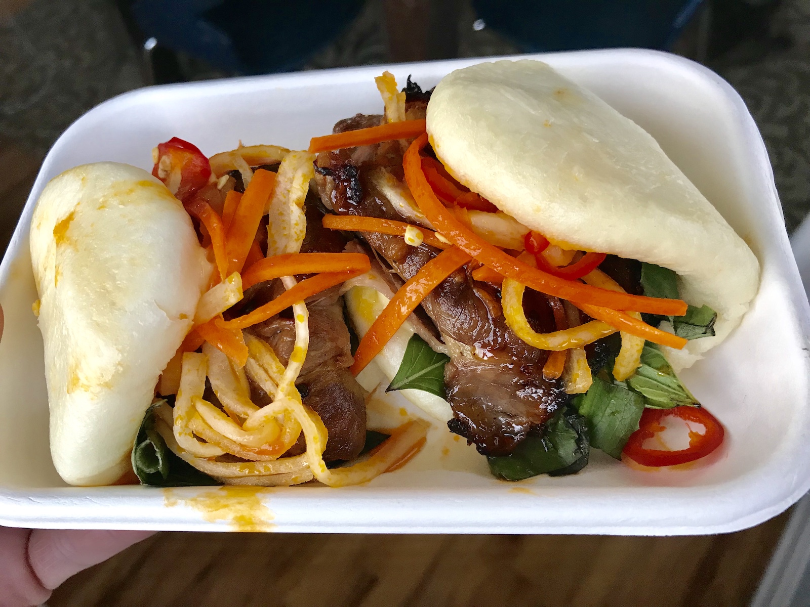 Delicate red chile shrimp dumplings (“siu mai”) come topped with crunchy fried shallots and a rich soy-chile-vinegar “gel” (which tastes a lot better than that sounds). Peking duck potstickers are beautifully pan-fried, full of tender meat, and paired with a thick hoisin sauce. If bao are more your thing, there’s a baked version filled with barbecue pork and a fluffy steamed bun filled with burnished slices of lemongrass pork and spicy pickles layered in long, julienned strands.
