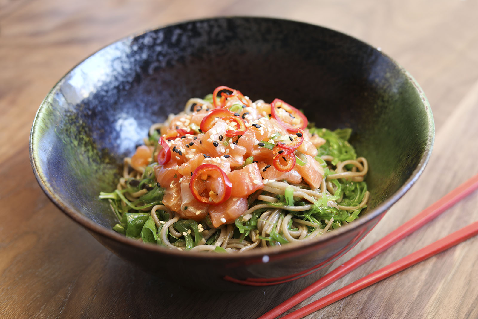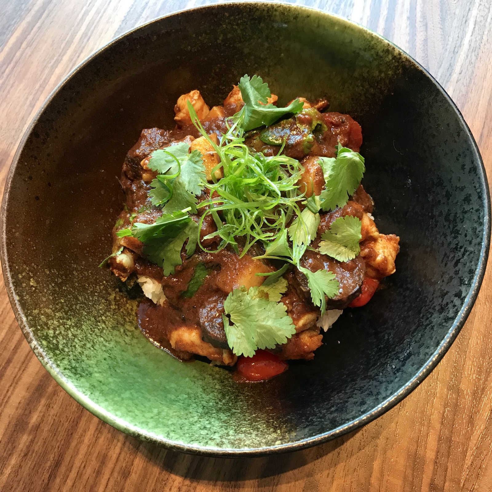 Cho77 does offer more than just dumplings (although we can’t imagine tiring of that side of the menu), including a salmon poke bowl made extra satisfying with the addition of cool, slippery soba noodles, marinated seaweed, and local Rebel Farms greens. The very spicy, very tasty shrimp vindaloo curry bowl seems made for cold, dreary days, served over steamed rice and bulked up with roasted root veggies like daikon, potatoes, carrots, and pearl onions.