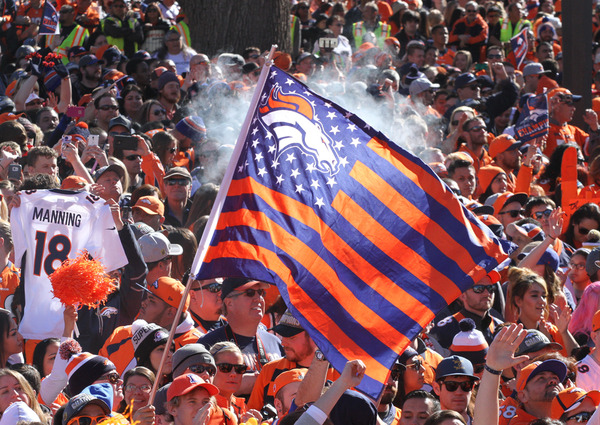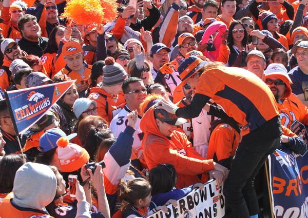 The streets of Denver were consumed in a sea of orange and blue yesterday, as Broncos fans poured in from all over the state to celebrate the team’s victory in Super Bowl 50. The parade began by Union Station, and marched along 17th Street to Broadway, and down to Civic Center Park, which was packed with an awaiting crowd. Annabel Bowlen, wife of ailing team owner Pat Bowlen, carried the Vince Lombari Trophy atop the parade’s first fire truck—by no coincidence, emblazoned with number 18—accompanied by game MVP and standout outside linebacker Von Miller, linebacker DeMarcus Ware, and of course, the Sheriff himself, Peyton Manning.