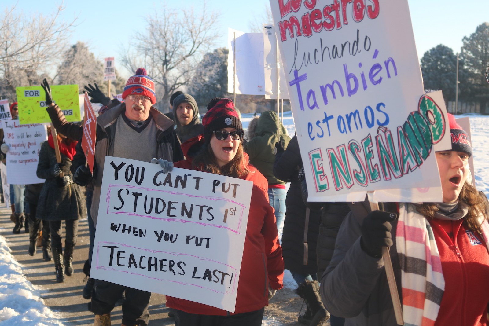 It was 16 degrees Monday morning in northeast Denver when nearly 100 teachers assembled on the sidewalk outside the Denver Center for International Studies at Montbello campus. Wearing winter boots, hats, and mittens, the teachers hoisted signs into the air and chanted at the top of their lungs. “What do we want? Fair pay! When do we want it? Yesterday!” went one refrain. Andrea Leggett, a physical education teacher at Montbello and one of the rally’s leaders, stood in the middle of the pack with a megaphone as her colleagues marched in a circle around her. “You left us no choice! You made us use our teacher voice!” she yelled, urging the crowd into a chorus.