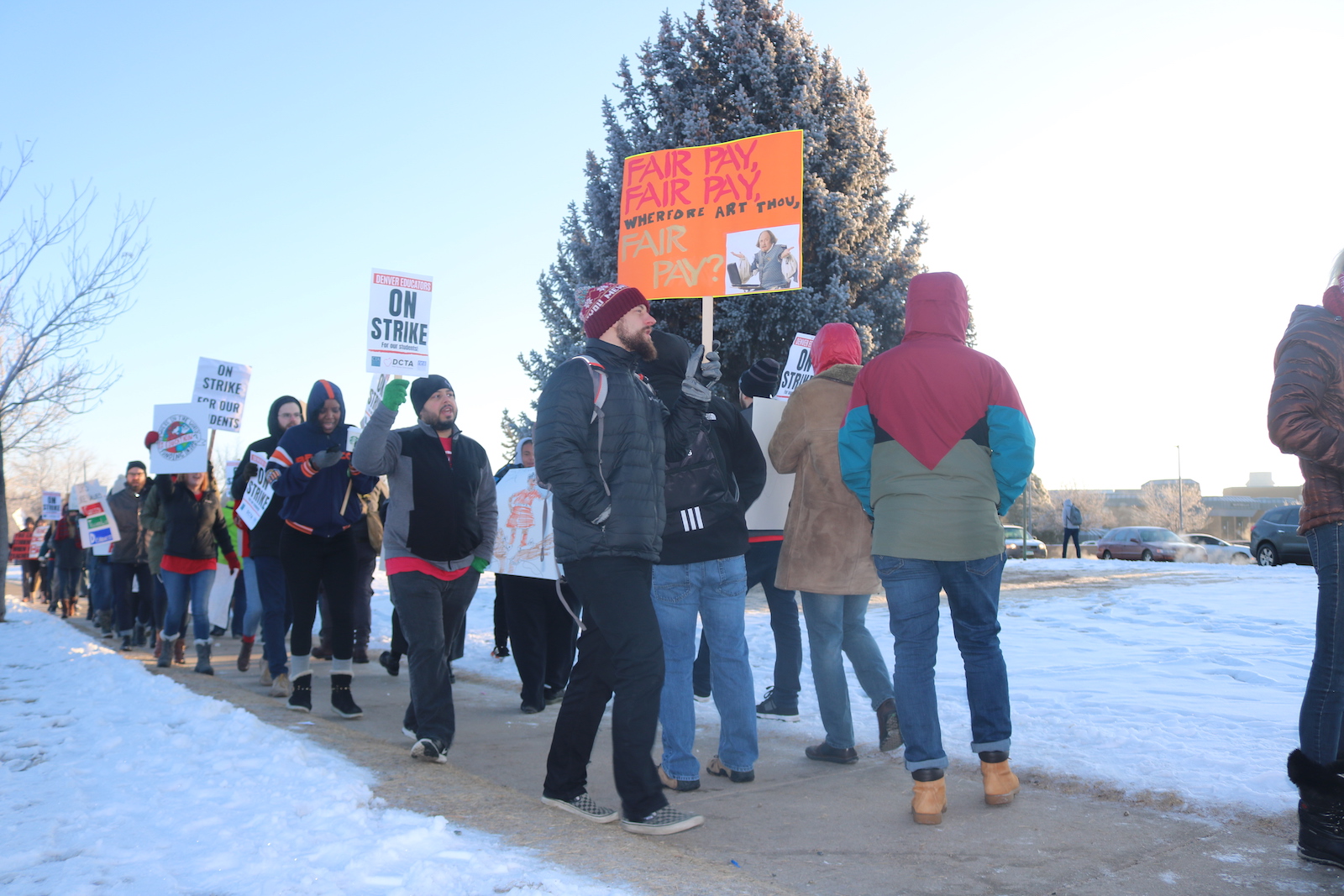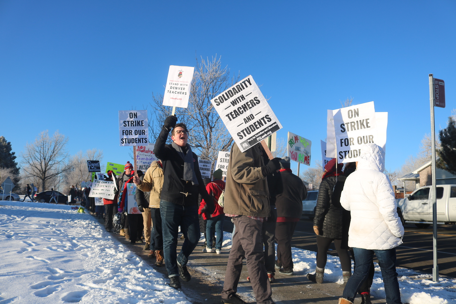 It was just after 7 a.m. and the picket line was a frenzy as students arrived for school, the first day in 25 years in which Denver Public Schools’ teachers were on strike. As cars passed, drivers honked their horns and gave thumbs up in solidarity with the teachers. Some drivers, recognizing an already chaotic atmosphere, burned donuts into the asphalt before peeling out down the street. Several parents left their cars and stood with the teachers. At least one student who had gone into the school came back outside after realizing there was no learning to be done there. The scene Monday morning was as raucous as it was frigid, and until the strike ends, things look to continue this way.