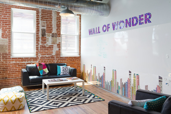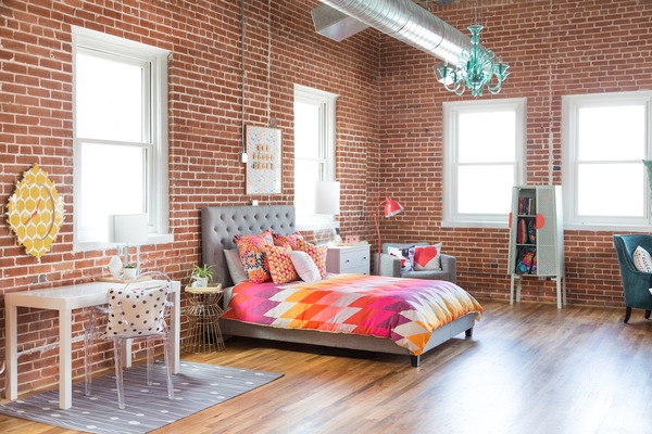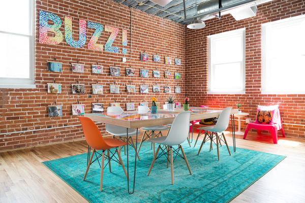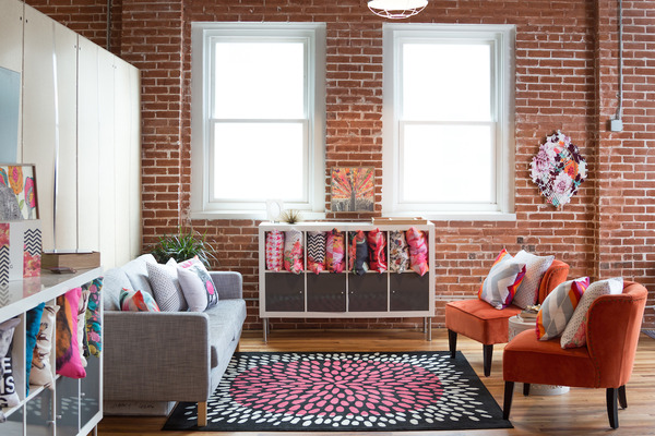 A year later, the space overflows with industrial-chic charm. New windows framed in crisp white look out onto the trending-up Ballpark neighborhood; insulation made from recycled blue jeans covers the ceiling above exposed pipes; and brick walls and a gleaming wood floor provide the perfect backdrop for DENY’s colorful printed wares. There’s even a staircase (and an elevator).