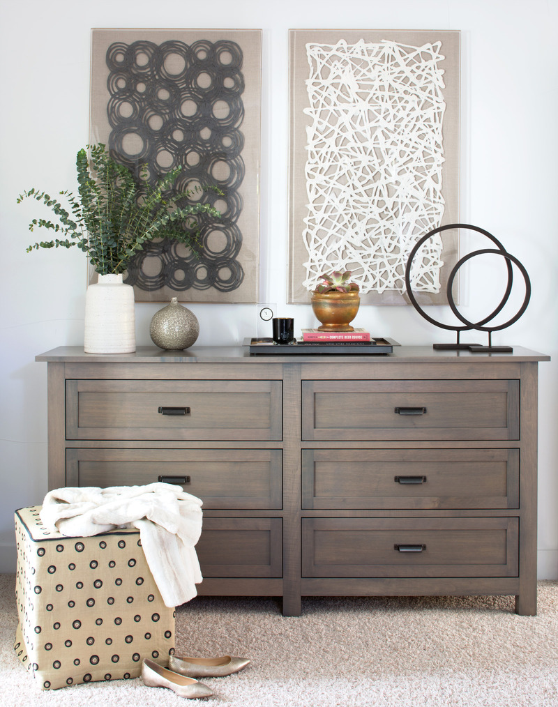 NW: It goes hand in hand with choosing colors and furniture. I’ll use a shape or tone in one room and then bring it into the next [room]. In the master bedroom, the dresser is taupe-y gray and very rectangular, and in the dining room, the chairs are taupe-y gray and rectangular. It’s about picking up on similar shapes and tones across different details. The birds [in the dining room’s artwork] mimic some of the color in the living room. For the painting [above the fireplace in the living room], we commissioned Duke Beardsley to create a piece that included the colors in the pillows.