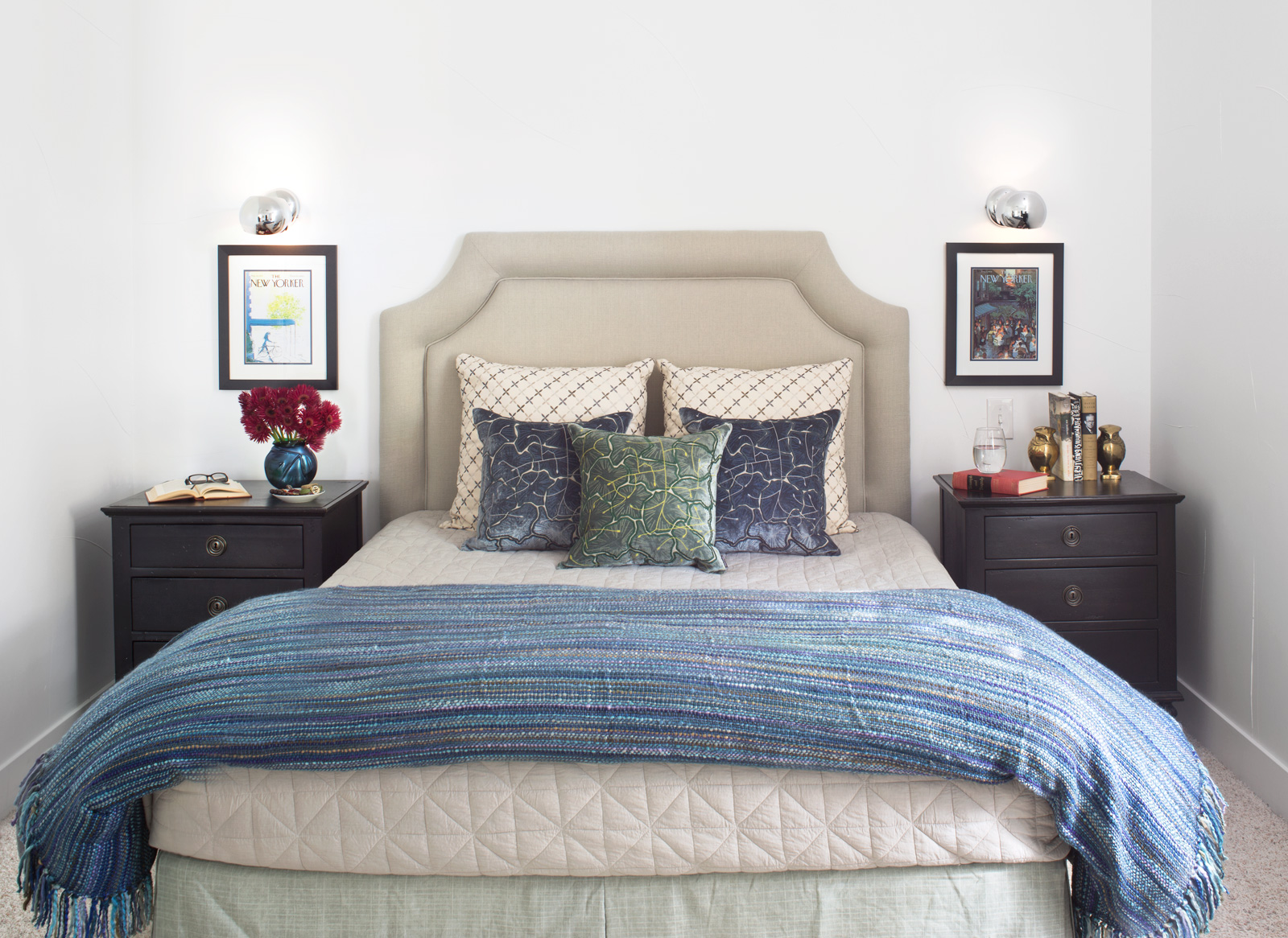 NW: You want things to relate to one another. You might notice that there’s a continuity to what you like: Your living room might have gold vases, and you might have two gold pillows in your study. You might have a red container in your office and red accents in the living room. If you include pieces you love that relate to one another, the design will be stronger.