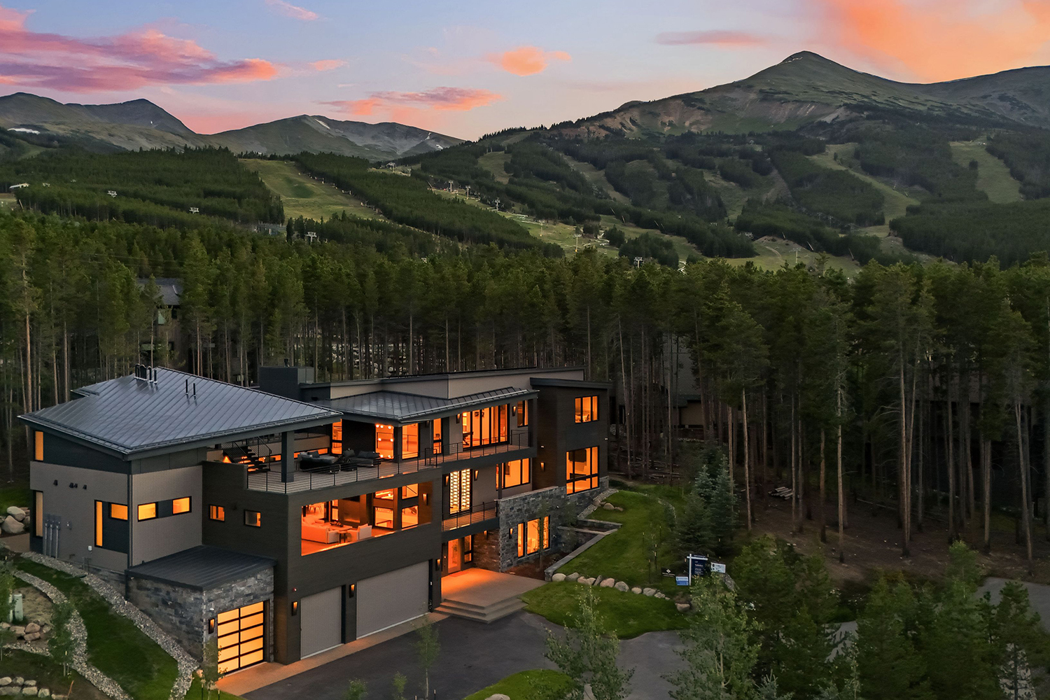 Geometric angular rooflines, minimal ornamentation, and a sleek visual representation provides a modern counterbalance to rustic materials.