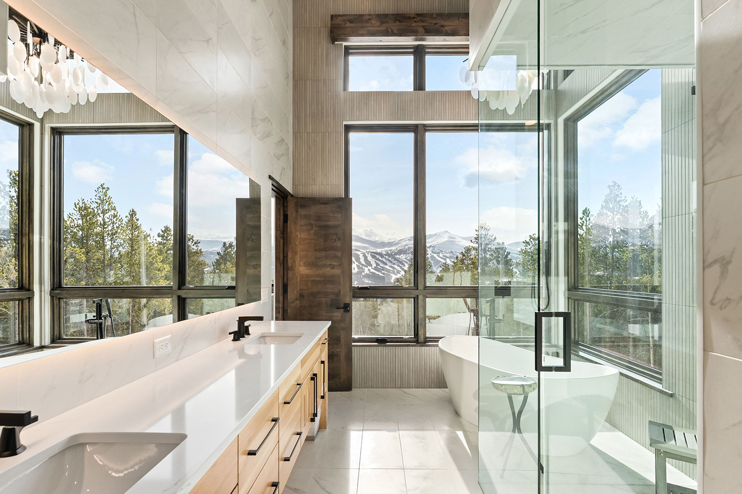 Floor-to-ceiling windows flood interiors with natural light and frame panoramic mountain vistas, creating a relationship between indoors and out.