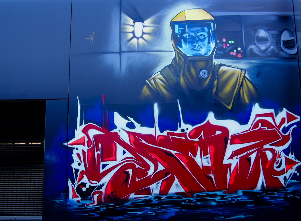 Arty Deeds—a compilation of 18 local street artists, including well-known names like Seno, Vogey, and Eaks—has been collectively working on separate scenes reminiscent of the season with plans to finish up before the first snow. Keep an eye out for a few new elements like a Denver logo resembling the Netflix brand and some more creepy scientists in space suits.
