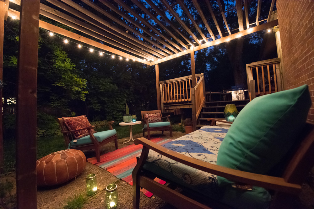 Bring rugs, pillows, and even curtains (if you have a place to hang them) outside. I like the idea of low tables. Get giant pieces of plywood from Home Depot or something and place them on cinder blocks. Then drape textiles over the top. Hang lanterns from trees, or it would be neat to place lanterns or hurricanes around in the grass (as long as they are enclosed). If you have a setting where you can do string lights over your sitting area, it would be pretty. Bring poofs out if you have them!
