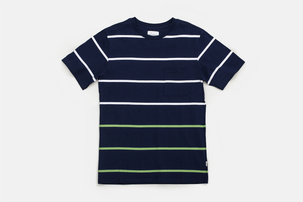 Block stripes are a big trend for men this season. To avoid the Charlie Brown effect, choose a T-shirt like this Saturdays Surf NYC Randall Shore Stripe Tee that combines thin and wide negative stripes.