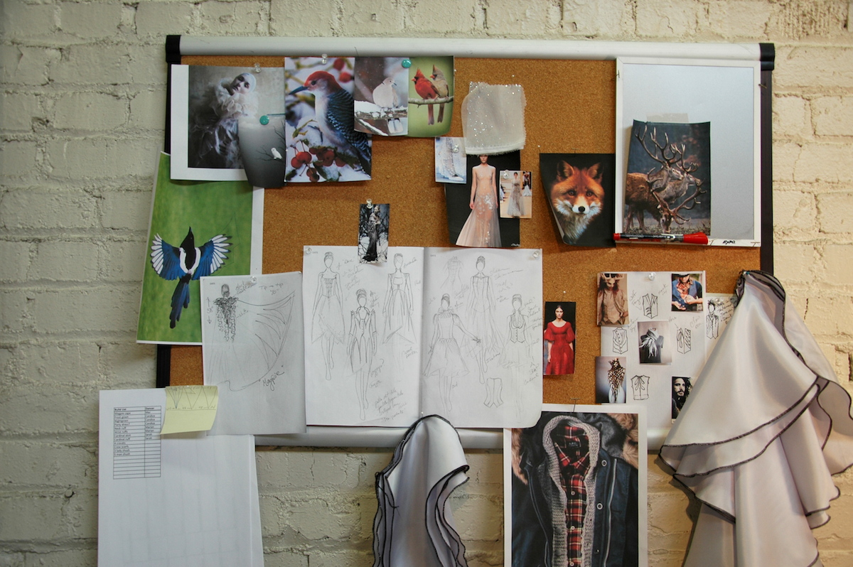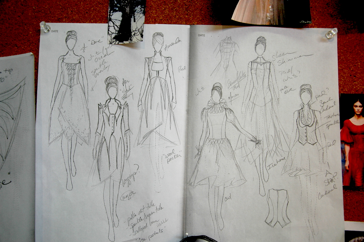Kras’ sketches for the female characters hang in her workroom. Each dancer represents a different winter bird: magpie, dove, woodpecker, cardinal, and owl. To get a sense of what these will look like, the cardinal will be adorned in a fluffy red skirt and a fitted vest with red ruching