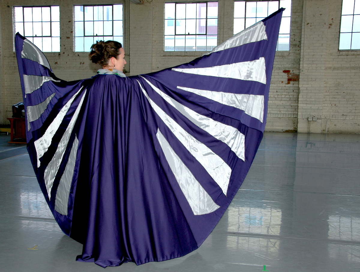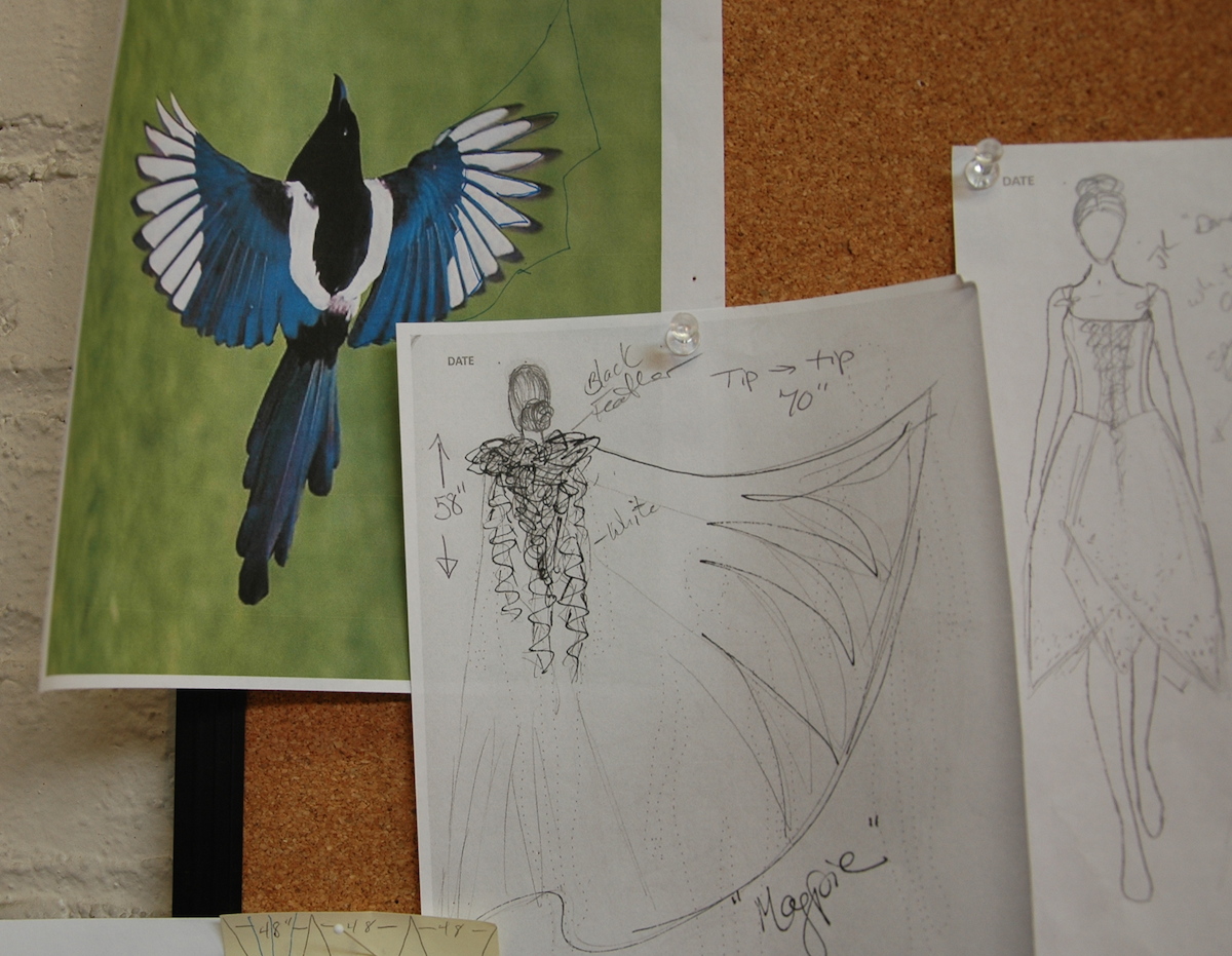 Kras models the magpie cape. Wooden poles are hidden along the edge, so the dancer, Meredith Strathmeyer, can lift and flutter the wings. (It also has ties that go around her waist to keep the cape in place as she dances.) In this case, the costume impacts the movement, so Kras worked to finish this piece before most of the others so Strathmeyer could rehearse with it