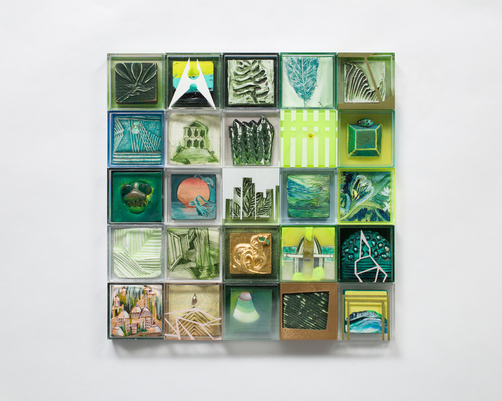 The miniature artworks—each no larger than two square inches and showcasing a single color in the visible light spectrum—completely cover the shaft of a column at the center of the gallery. Their thoughtful arrangement replicates what happens when a beam of light passes through a prism and emerges as a rainbow (another symbol of paradise).