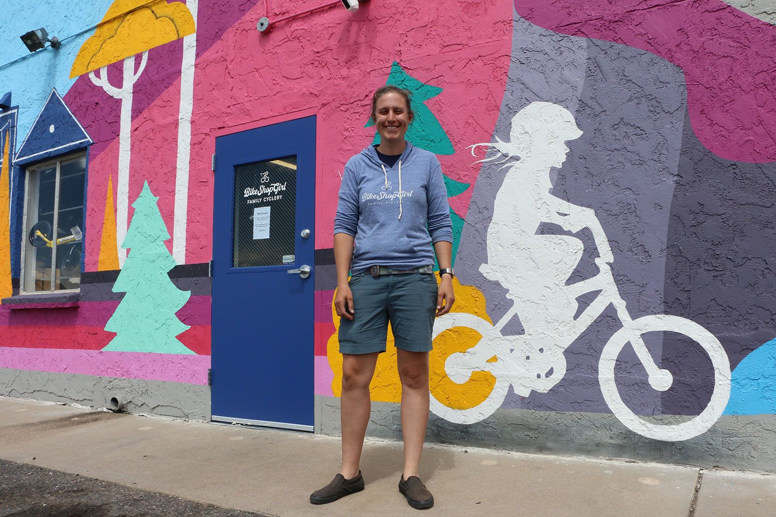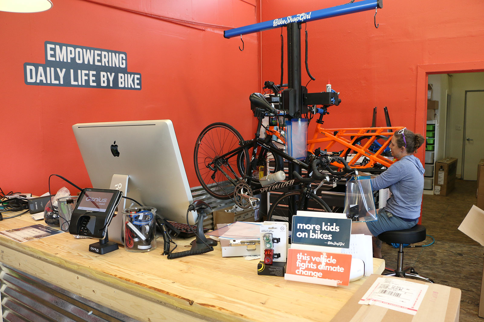 The first clue that Bike Shop Girl Family Cyclery isn’t a normal bike shop is the kids’ play area, which features a munchkin-height table and chairs, a pile of puzzle games, and art materials. “When I was building out the shop, [bike] brands would ask, ‘How much space are you giving to kids? Are you crazy?’” recalls owner Arleigh Greenwald. “I’m just like, ‘That’s why I’m opening a bike shop!’”