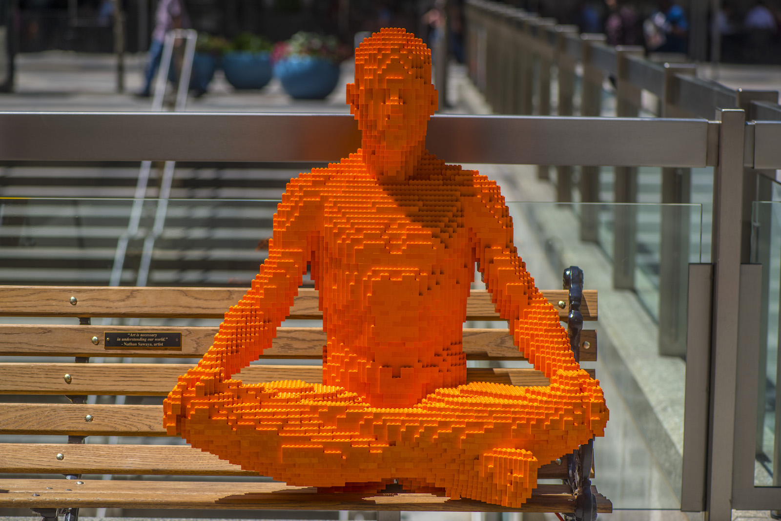 “When I am using these Lego bricks for these sculptures, it’s all sharp corners and right angles. Then, you take a step back and you get a different perspective—and that’s life,” he says.