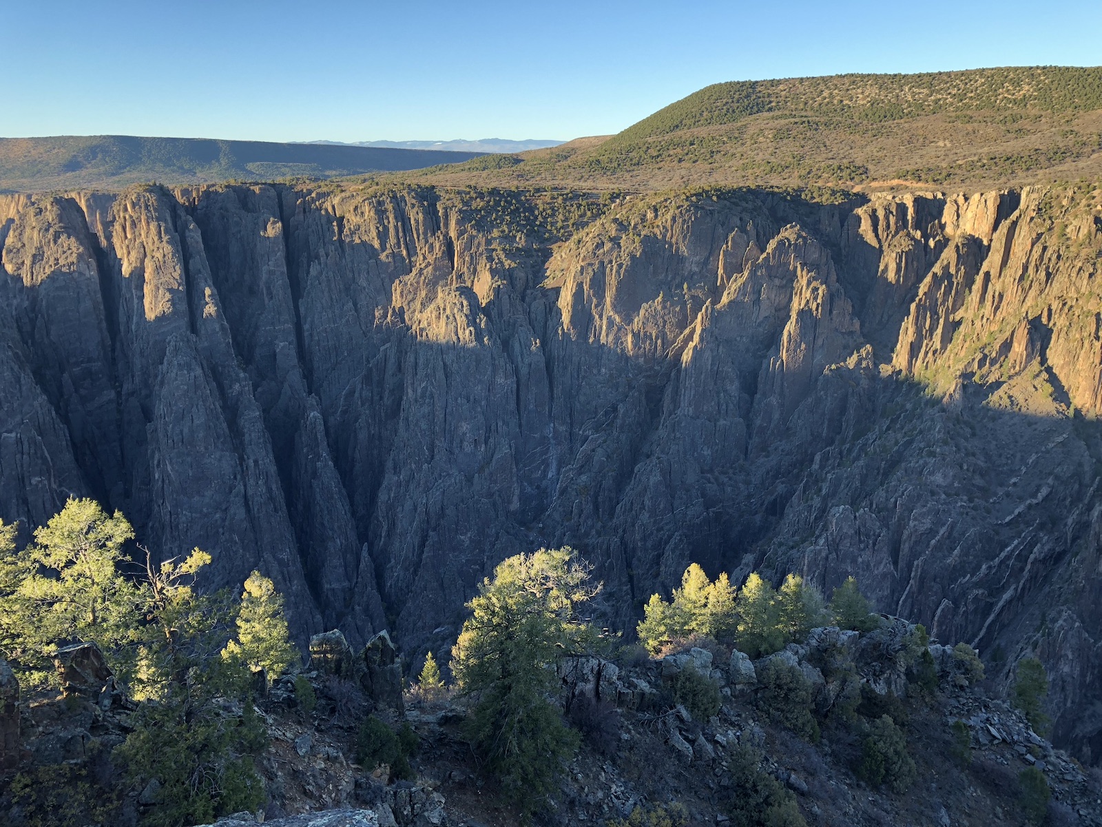 5:30 p.m. Passing through the farming towns of Olathe and Delta, I end the day at Black Canyon of the Gunnison National Park outside Montrose. Driving along the south rim at sunset, the canyon seems even more beautiful than it was when I visited in high school. The impossibly jagged rocks, sheer cliffs and soaring birds along the canyon walls make this one of my favorite stops on my entire journey.