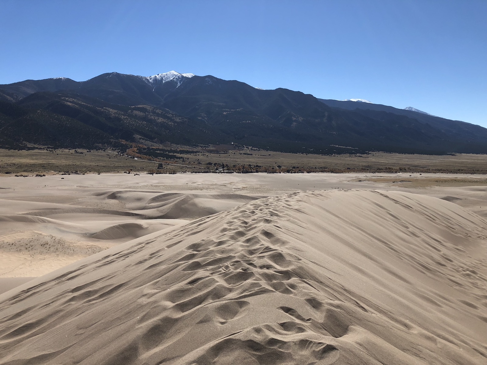 11:30 a.m. After a quick stop to take some photos of Chimney Rock National Monument from a distance (the road up to the monument’s Puebloan dwellings is closed to cars nearly eight months of the year), I take a hiking expedition up the sand at Great Sand Dunes National Park and Preserve. I watch groups of people hilariously take their sleds and snowboards out on the soft, fine sand for a joyride. Unlike my first visit to the Dunes in eighth grade, I’m not getting sandblasted as I bask in the view of the Sangre de Cristo mountains skirting the park. Along with the Black Canyon of the Gunnison, this is another favorite park—mostly because you can combine fun physical activity with jaw-dropping views. As I’m writing this, I still have a pit of sand in my shoes.