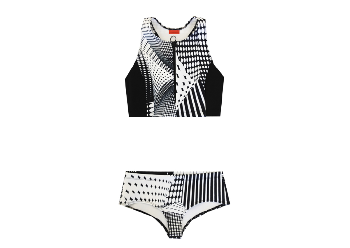 Swimsuit: Black and white goes high-tech in a geometric digital print by Clover Canyon. The neoprene material (used for wet suits) and athletic halter cut are a nod to this season’s surfer girl-trend. Find It: $90, Garbarini, 239 Detroit St., 303-333-8686, garbarinishop.com