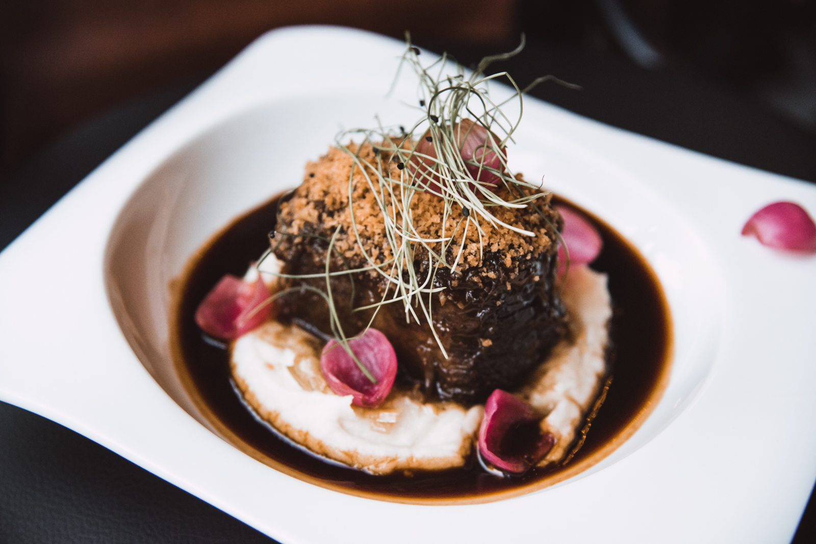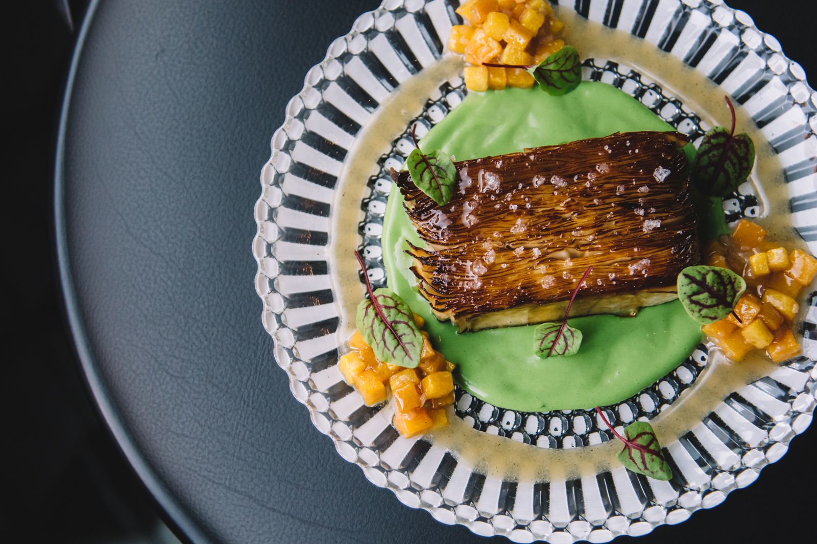 Gracefully spanning “gourmandise” small plates, vegetable-centric dishes, and entrées of meat and seafood, LeRoux’s menu takes care of all sorts of eaters. Dining with vegetarians? LeRoux has a dedicated vegetable section on its menu that delivers clever, technique-driven spins on classics. Take the beet and goat cheese salad—a traditional combo—for which Symensma and Stoneking freeze the creamy cheese and then grate it in snowy drifts over roasted beets, citrus, arugula, and a rich chestnut cream. Cauliflower and mushrooms take center stage in what would typically be dessert preparations: The cauliflower transforms into a savory crème brûlée with raisins and salty capers, while paper-thin slices of king trumpet mushrooms are compressed and roasted into a buttery “mille-feuille” (typically a multi-layered pastry) that’s as gorgeous as it is delicious.
