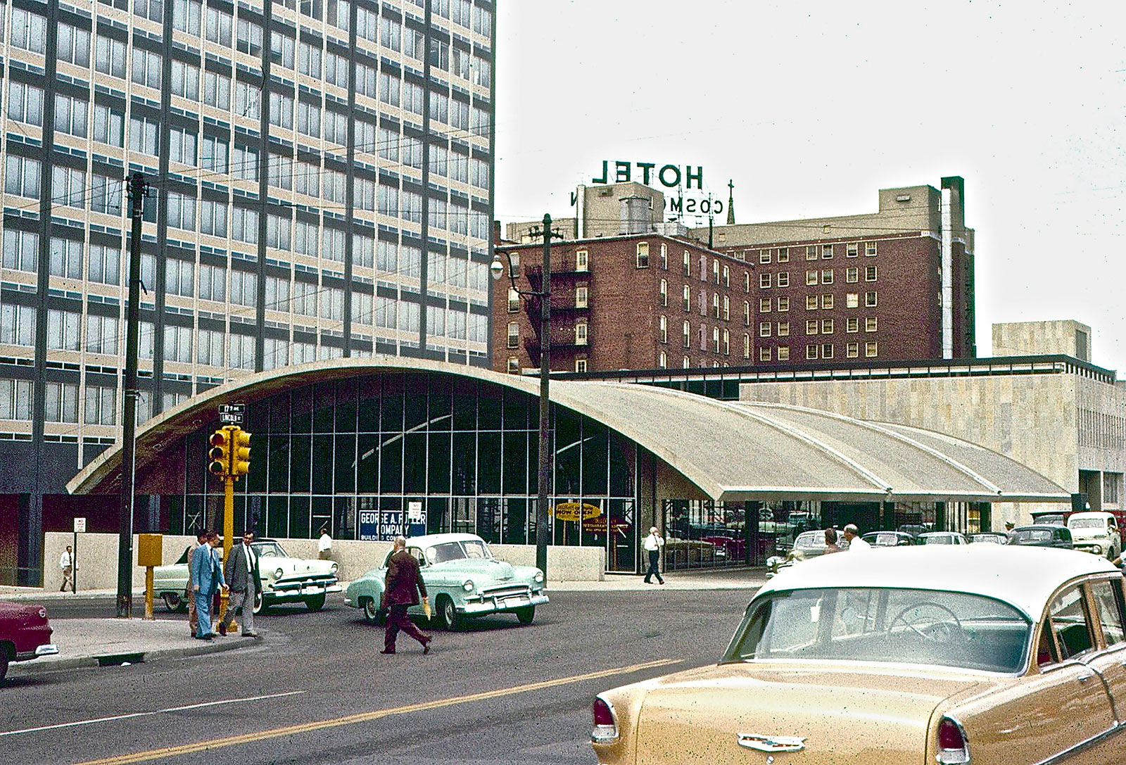 By the early 1990s, the department store had closed and the building’s owner struggled to lease the space. Desperate to activate a key segment of the 16th Street Mall, officials under the administration of Mayor Wellington Webb allowed hotelier Fred Kummer to take over. Despite the passionate voices of preservationists, he bulldozed the paraboloid, sheathed the department store in shiny black glass, replaced the skating rink with an awkward driveway, and reopened the hotel as the Adam’s Mark (it’s now the Sheraton).